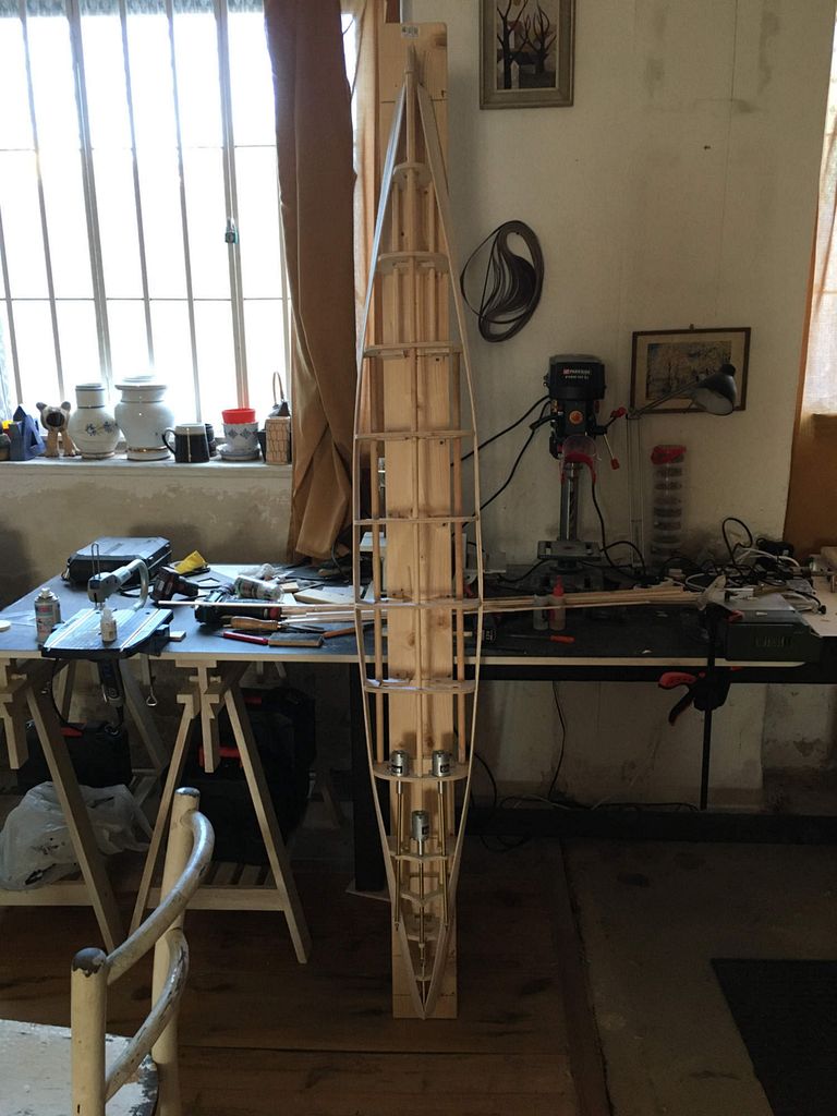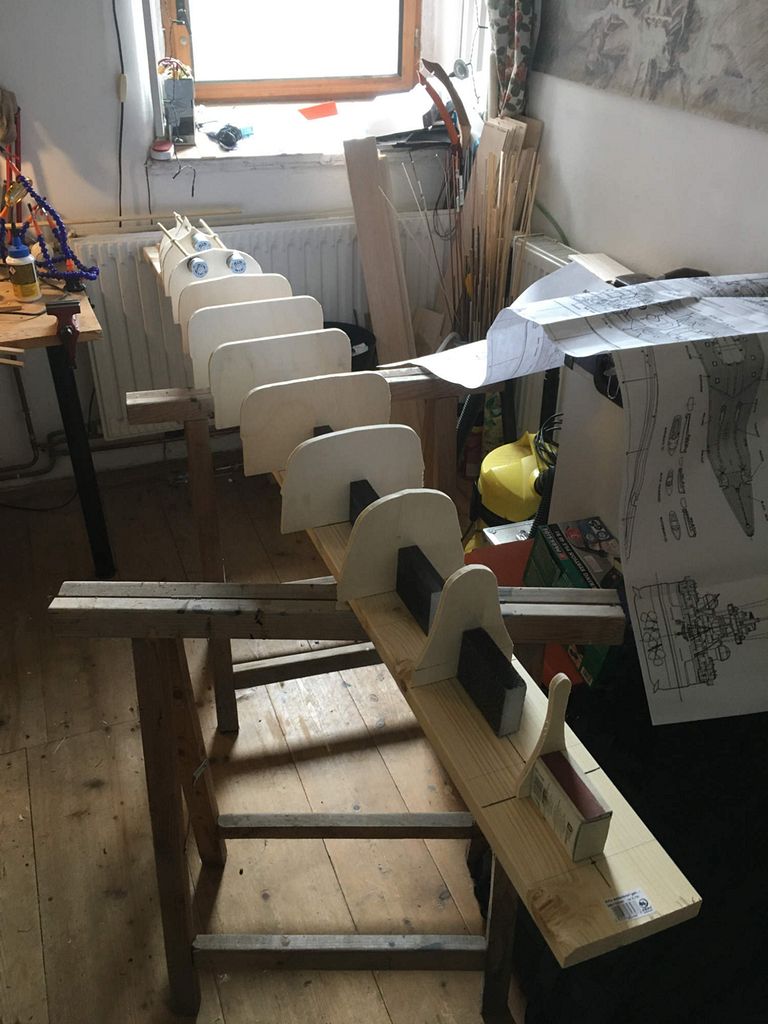 Samotná stavba již probíhá klasicky: překreslit žebra na překližky tl. 8 mm, svrtat otvory pro nosné kulatiny a celou kostru umístit na pracovní desku – v mém případě spíš pracovní fošnu. Následně došlo k umístění hřídelí a motoru. V modelu jsou tři kusy MIG 500 Turbo 12V na hřídelích MP JET s přírubou – dle mého nejjednodušší a nejspolehlivější řešení. Asi nejoblíbenější část stavby následuje– oplaňkování balsou tl. 4 mm, po kterém loď konečně dostane tvar. Posléze nahrubo zatmeleno, obroušeno a přes balzu dvě vrstvy lamina. Pak přichází naopak nejneoblíbenější část – tmelení a broušení.