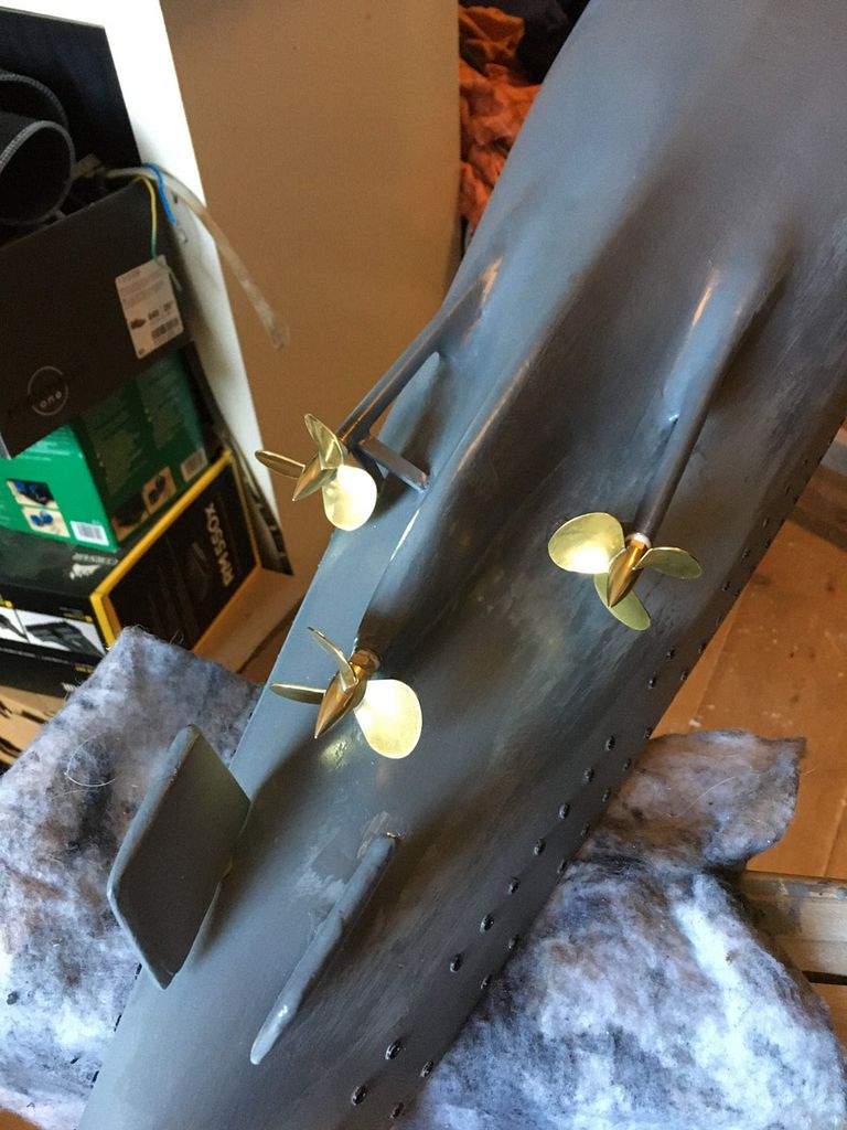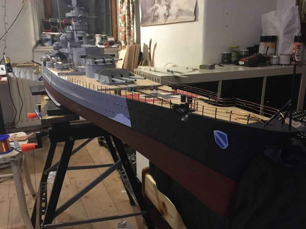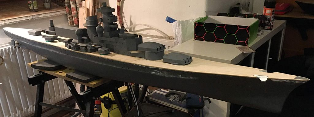 Když bylo potvrzeno, že loď plave a pluje, pustil jsem se do vrtání a osazování okének (cca 170x na každé straně) dále nahrubo připravená paluba a začátek formování nástaveb. Od začátku bylo jasné, že se věže budou otáčet – proto je pod každou věží umístěno servo s rozšířeným úhlem otáčení na 270° a zpomalovačem.