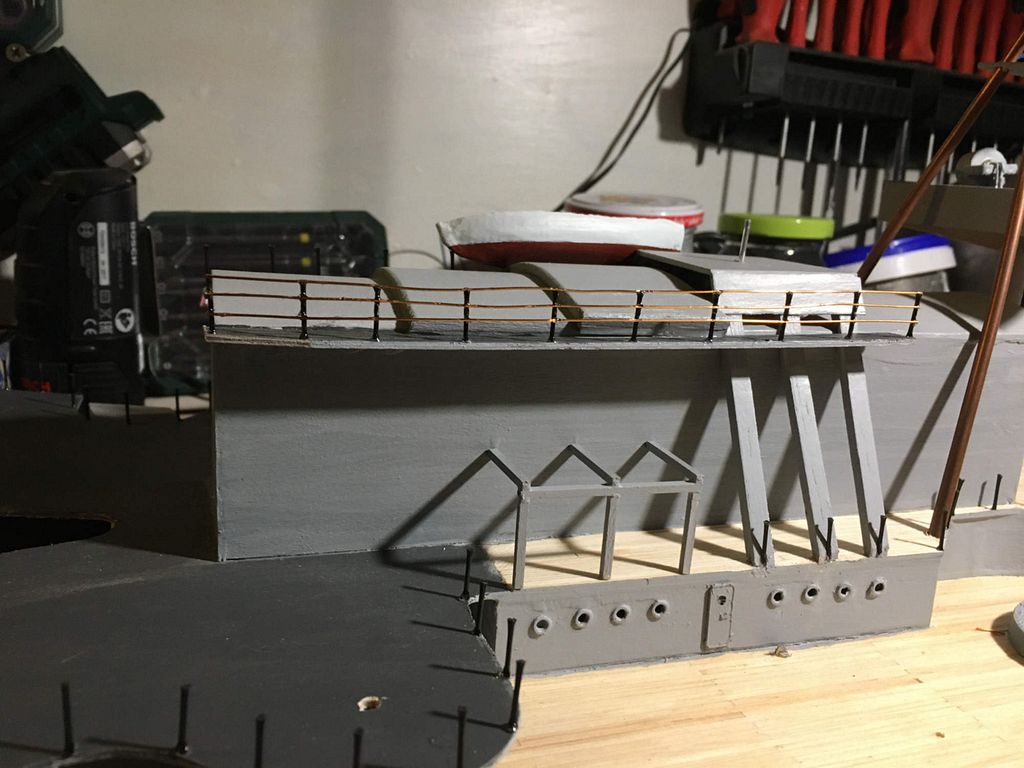 V průběhu řešení všech funkčních prvků na lodi docházelo k postupnému dodělávání paluby, ta je celá seskládána ze smrkových lišt 2x2 mm délky 10 cm, celkem na palubu padlo 140 metrů. Další poměrně dlouhou činností byla výroba zábradlí. Sloupky jsou z uhlíkové kulatiny zavrtané a zalepené do paluby (přeci jen se jedná o nejčastěji ulámaný detail na lodích) a vodorovné žbrdlení bylo proti původnímu plánu (režná nit) uděláno z měděného drátu z důvodu vytvarování oblých částí.