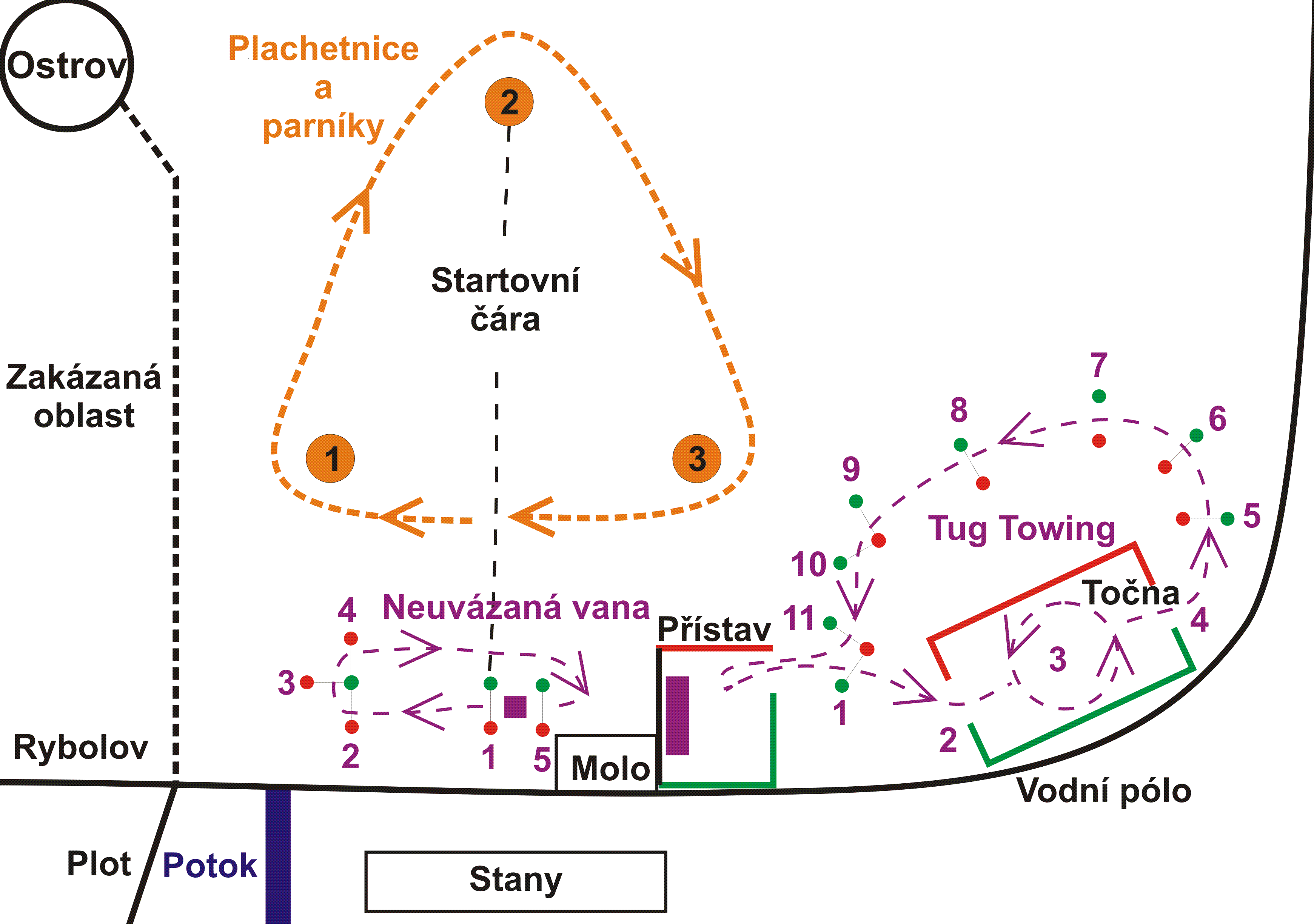 Po celou dobu lze na vodě provozovat veškeré momentálně nesoutěžící modely mimo soutěžní dráhu na nekolidujícím kanále - přednostní právo na kolíček opravňující k provozu RC soupravy bude mít ten, jehož model spadá v daném čase do preferované soutěžní skupiny.