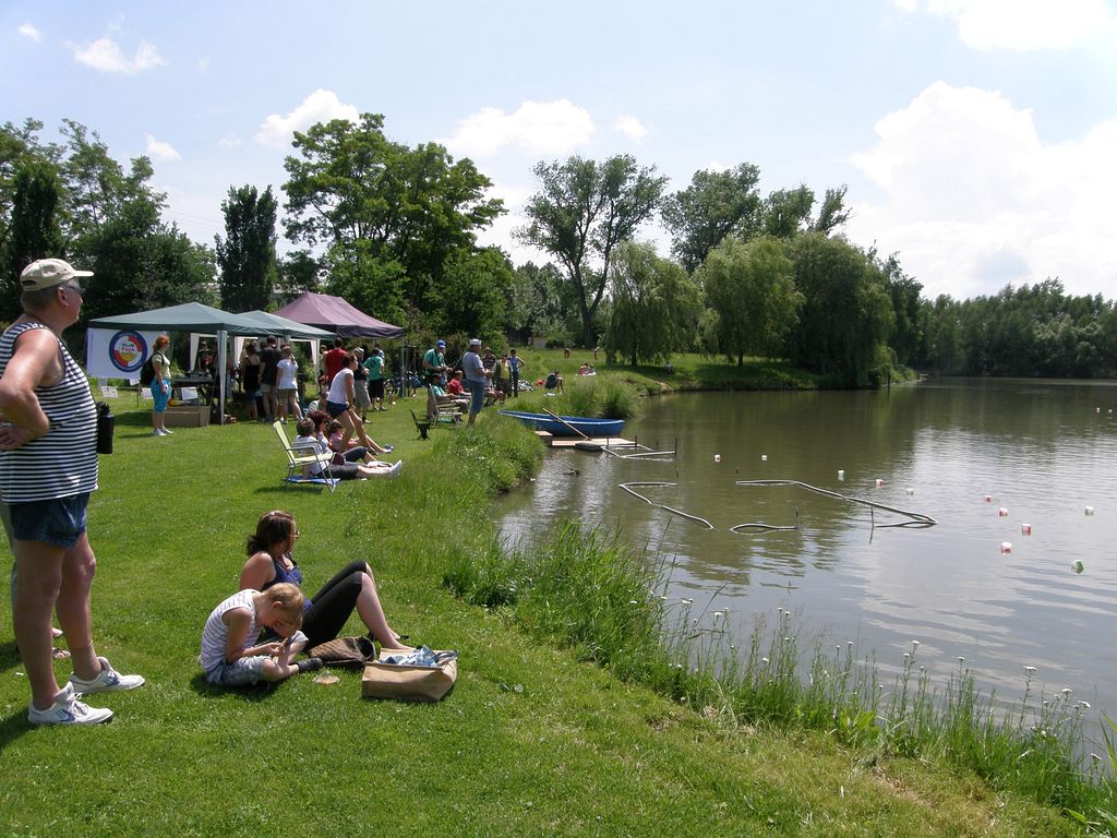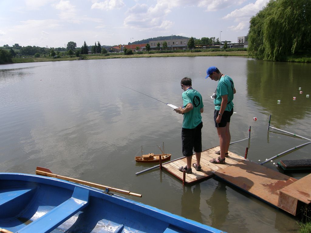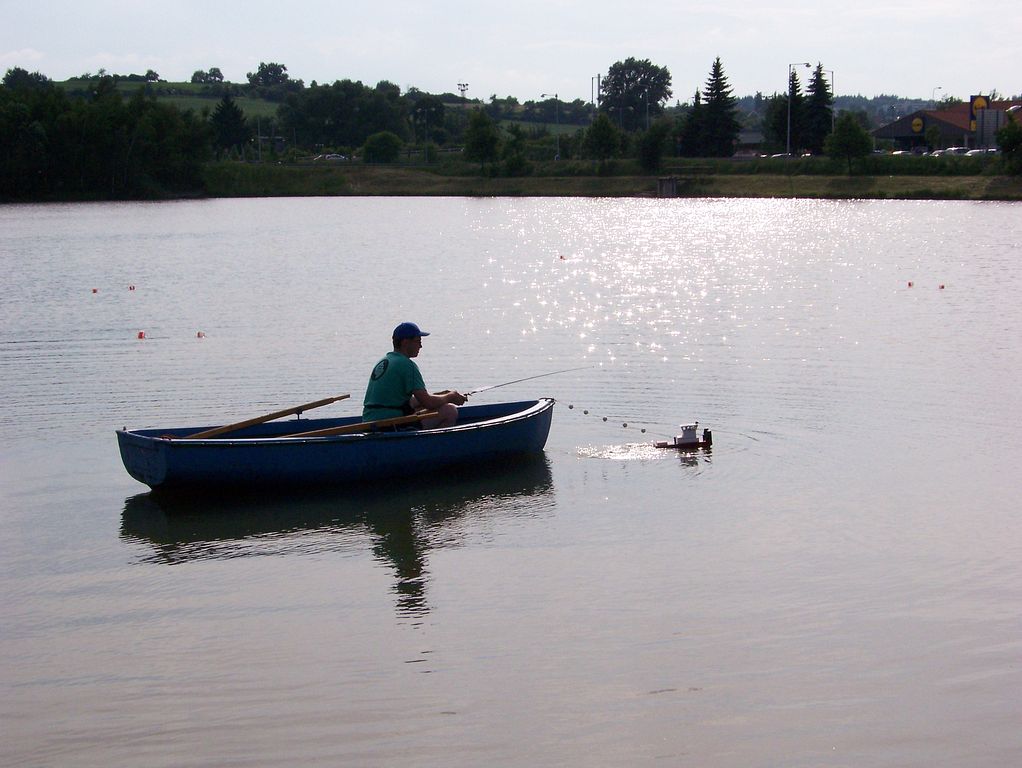 Zatímco suchozemské krysy budovaly na břehu zázemí, vrhl jsem se s Bohoušem do pramice a hurá na vodu. První zádrhel nastal už ve chvíli, kdy jsme se nemohli rozhodnout, jakou stranou trojúhelníku začít, aby nám krásně vyšel tak, jak ho potřebujeme. To se najednou ukáže, že obří část rybníku, kterou nám rybáři vyhradili pro naše radovánky, zase tak obří není. Ale na to člověk přijde teprve ve chvíli, kdy má 30metrovou stranu hotovou - takže zpátky na začátek a celek o 10 metrů posunout.