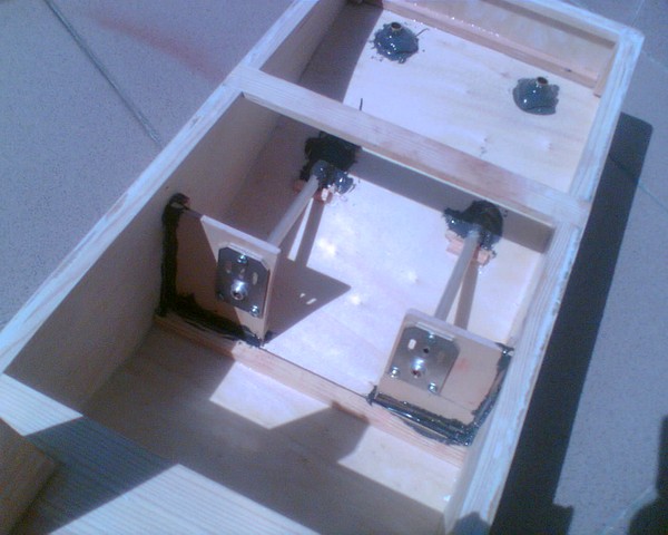 Celý trup jsem olaminoval tkaninou 80gr. a pryskyřicí Letoxit. Po vybroušení laminátu došlo na instalaci hřídelí s převodovkami 1:3 zakoupené v Admiralshopu a 50mm otočných dýz od Robbe. Čela převodovek jsou přišroubována na 4mm leteckou překližku v místě spoje s trupem vyztuženou nosníkem 6x6mm, stejně tak i lože serv HS-81, každé na jednu dýzu. Vše jsem do trupu vlepoval 30 minutovým epoxydem s kovovým plničem. Po usazení jsem vnitřek trupu důkladně vymazal Letoxitem a na epoxy nalepil palubu z 1mm letecké překližky.