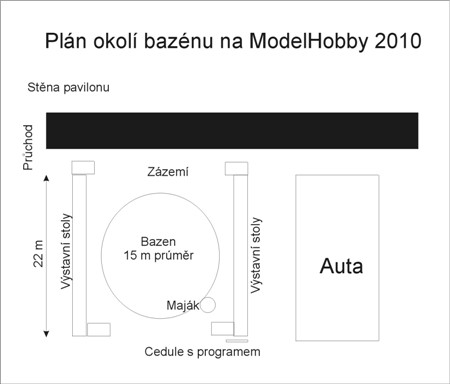 mám pro vás pozvání na tradiční veletrh Model Hobby 2010, který se koná v PVA Letňany v termínu 30. 9. až 3. 10. 2010, a to především pozvání pro ty, kteří se nebojí aktivně zapojit do dění u bazénu, který bude mít 15 metrů v průměru a hloubku od 40 do 50 cm (podlaha haly je lehce do sklonu).