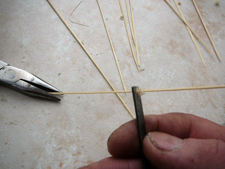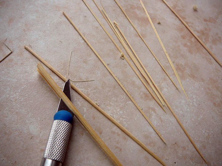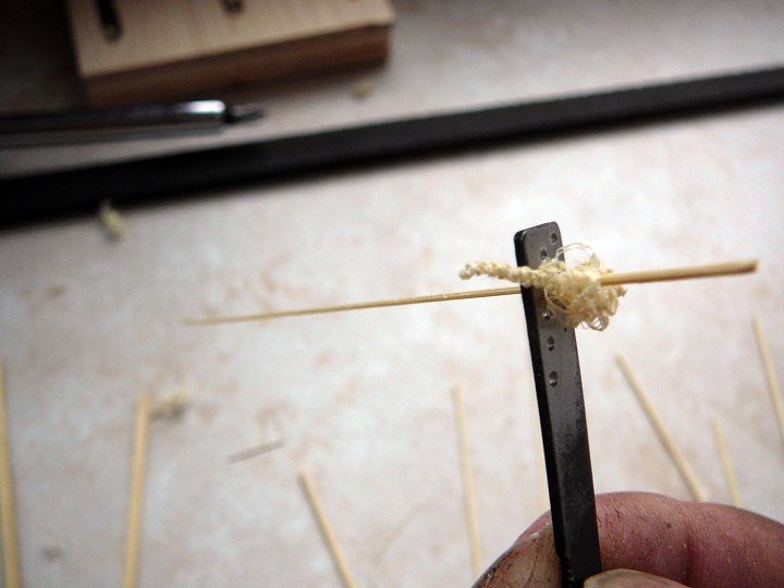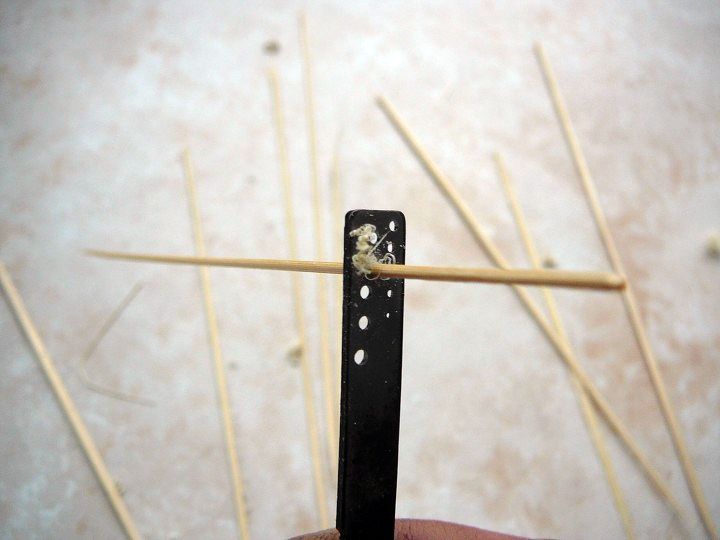 Jednotlivé plaňky lodní obšívky byly ukotveny na žebra kostry dřevěnými kolíky. Tak stejně i paluba. Ve skutečnosti odpovídal průměr kolíků 1/3 síly plaňky, ale maximálně 4,4cm, což u měřítka 1:48 je 0.9mm. Je lepší použít ještě o něco menší průměr pro dokonalejší autentičnost modelu.