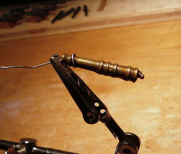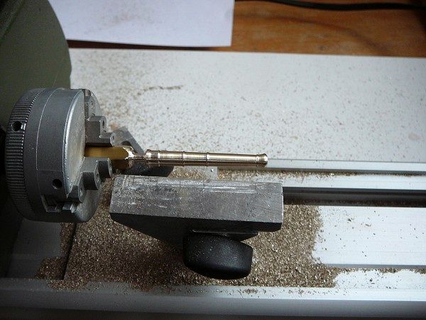 Mosaznou kulatinu jsem nahrubo osoustružil do krajních průměrů, podle podloženého výkresu jsem označil místa prstenců a stočil na průměry. Nakonec jsem snížil části hlavně mezi prstenci, vyleštil čtyřstovkou smirkem a vytočil jsem kuličku (Button) na konci děla. Ve svěráku vrtačky doraz,(ti kteří si moc nevěří, si mohou vyrobit pomocné čelisti třeba ze dřeva, do kterých vloží hlaveň děla na vrtání otvoru pro čepy), aby vrtání otvoru pro čepy bylo na všech hlavních stejné, vytočil čepy z mosazné kulatiny a narazil je do hlavní. Pokud by se jednalo o větší počet děl stejných rozměrů, pak by se vyplatilo vybrousit si profilový nůž, ale při deseti kusech, které jsem potřeboval, je to rychlejší od ruky a měřit.