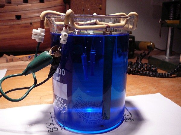 Jako zdroj proudu jsem použil rezervní nabíječku na mobil. V kádince je roztok síranu měďnatého a kyseliny sírové koncentrované. V popiscích schématického nákresu je doporučené napětí a proud, jaký je ideální pro vyloučení mědi na pokovovaný předmět. Dělo jsem uvázal na slabý drát a na drátu udělal háček tak, aby dělo po zavěšení na katodový závěs viselo zhruba uprostřed kádinky. Před pokovením jsem dělo uchycené na drátu namočil do 65% kyseliny dusičné pro odstranění zoxydovaných částí a nečistot a po opláchnutí vodou jsem je zavěsil do kádinky.(Ještě před namočením do kyseliny dusičné je lepší odstranit z dílů větší nečistoty ocelovým kartáčkem, jako třeba zoxydovaný povrch mosazného plechu ze kterého vyrobíte třeba závěsy kormidla, nebo poklopů střílen, protože kyselina dusičná silně leptá povrch mosazi a při delším ponoření by mohly tenké části zmizet). Proud jsem zapnul na zhruba dvě minuty. Po vyjmutí z lázně opláchnout vodou, usušit třeba papírovým ubrouskem tak, abych se nedotkl povrchu děla prsty a stále uvázané na drátku ponořit do patinovacího roztoku. Ihned vyjmout, nechat působit asi čtvrt minuty, opláchnout pod vodou a ponořit do neutralizační lázně z roztoku jedlé sody. Osušit, oddělat drát a hadříkem přeleštit.