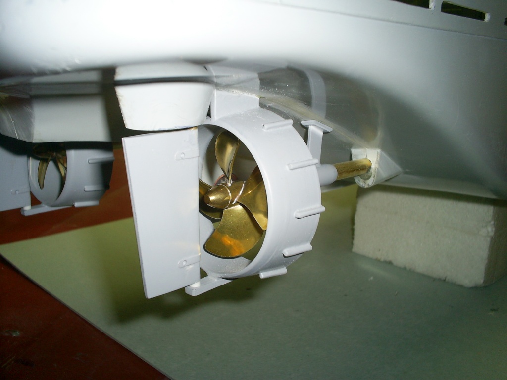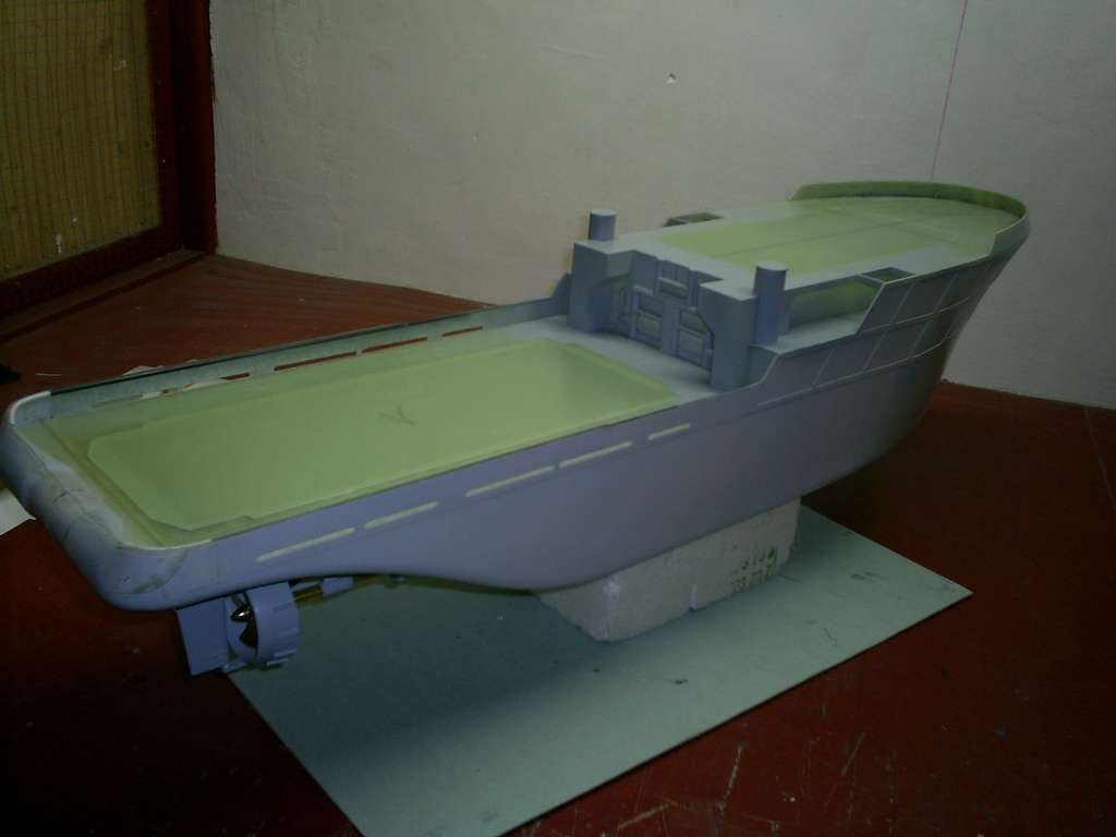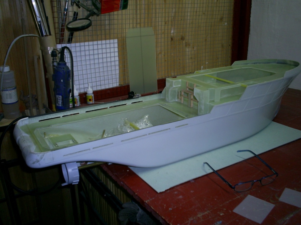 Model je ve fázi základní stavby trupu s „vanovými“ zkouškami výtlaku, těsnosti a funkčnosti příčných a hlavních pohonů. Souběžně se realizuje dřevěné obložení pracovní paluby a konstrukce horní hlavní nástavby.