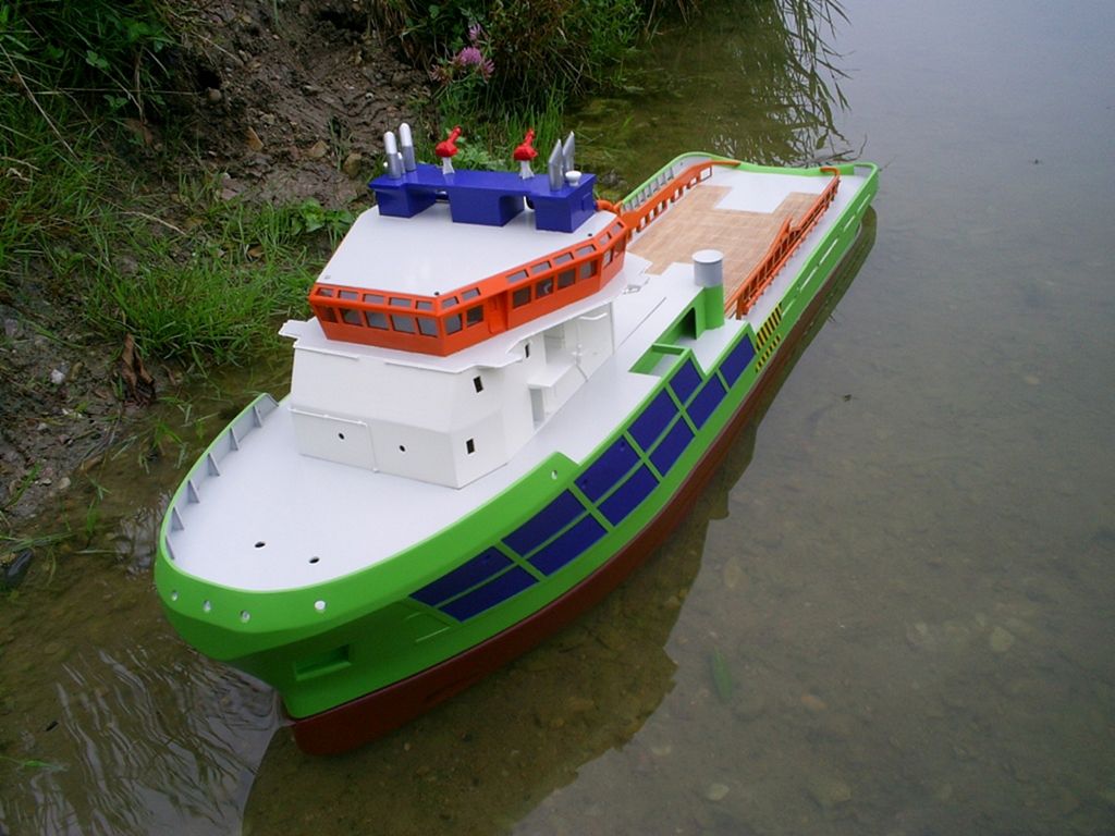 Pokud by byl nasazen do soutěžních plaveb v TT, tak ani tam by s regulací pomocí příčných pohonů tak jak je teď nebyl problém. Moje remorkéry měly příčné pohony vždy jen na přepínač typu jede/nejede. Žádná regulace a taky žádný problém :-)