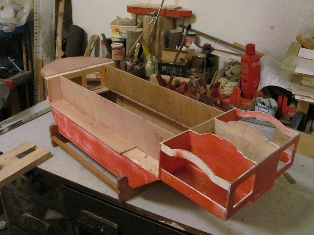 Dno trupu je vyříznuto z 4mm překližky, boky 5mm balza, oblý přechod outorů je tvořen bukovou kulatinou Ø 10 mm. Příď je natvarovaná balzovými špalíčky, obroušena a přetmelena, na zádi jsou přilepeny náběhy pod kolesnice. Výsledkem je dolní část trupu, který je dělený na výšku. Následovalo lepení dolní paluby z pásů překližky a příďového zesílení. Jako další krok bylo olaminování trupu. Měl jsem zbytky tenčí skelné tkaniny, laminoval jsem pomocí CHS Epoxy 1200, což odborníci nedoporučují… lepší je použít přímo laminovací pryskyřici. Pro zpevnění balzového trupu jsem jej napustil Epoxy 1200 silně ředěnou nitroředidlem C 6000. Po vyprchání ředidla tuhla pryskyřice asi týden, ale nakonec zatuhla ke všeobecné spokojenosti… a trup se stal nejen pevnějším, ale také odolným zevnitř proti navlhnutí vodou.