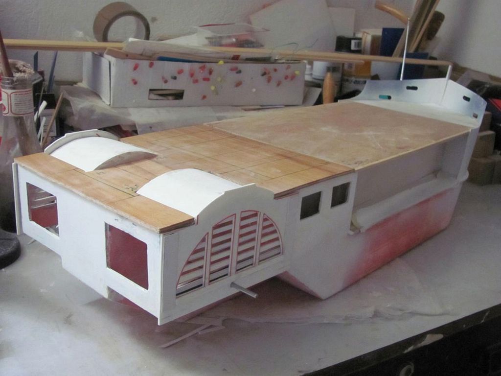 Kromě opakovaného tmelení a broušení jsem začal lepit nástavby na horní palubu. Původní plán vyříznout díly nástavby z 3mm topolové překližky jsem velice rychle opustil potom, co se mi jednotlivé dílky začaly štípat a rozpadat se. Podařilo se mi nakonec sehnat 2mm PSH desku, ze které jsem začal postupně vyřezávat díly a lepit je po úpravě dohromady.