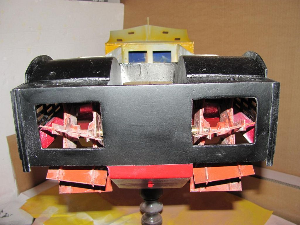 Příruby jak pro kolesa, tak pro motory jsem si musel nechat zhotovit u místního soustružníka. Původně jsem chtěl uložit motory v trupu na zkosení dna na zádi, na oba boky. Šikmé uložení ale značně zkomplikovalo usazení nových motorů, a tak jsem byl nucen dodatečně vložit základnu pro motory „ze sklepa do přízemí” do úrovně první paluby, kde jsem musel proto odříznout vnitřní stěny „přístavku”. Po nasazení řemínků jsem zjistil, že budu muset udělat navíc v základní desce z překližky 4mm zářez, jinak by se řemínky nedaly nasadit. Na tyto dodatečné úpravy jsem si už docela i zvykl. Nic není definitivní, i když to na výkrese vypadá perfektně.