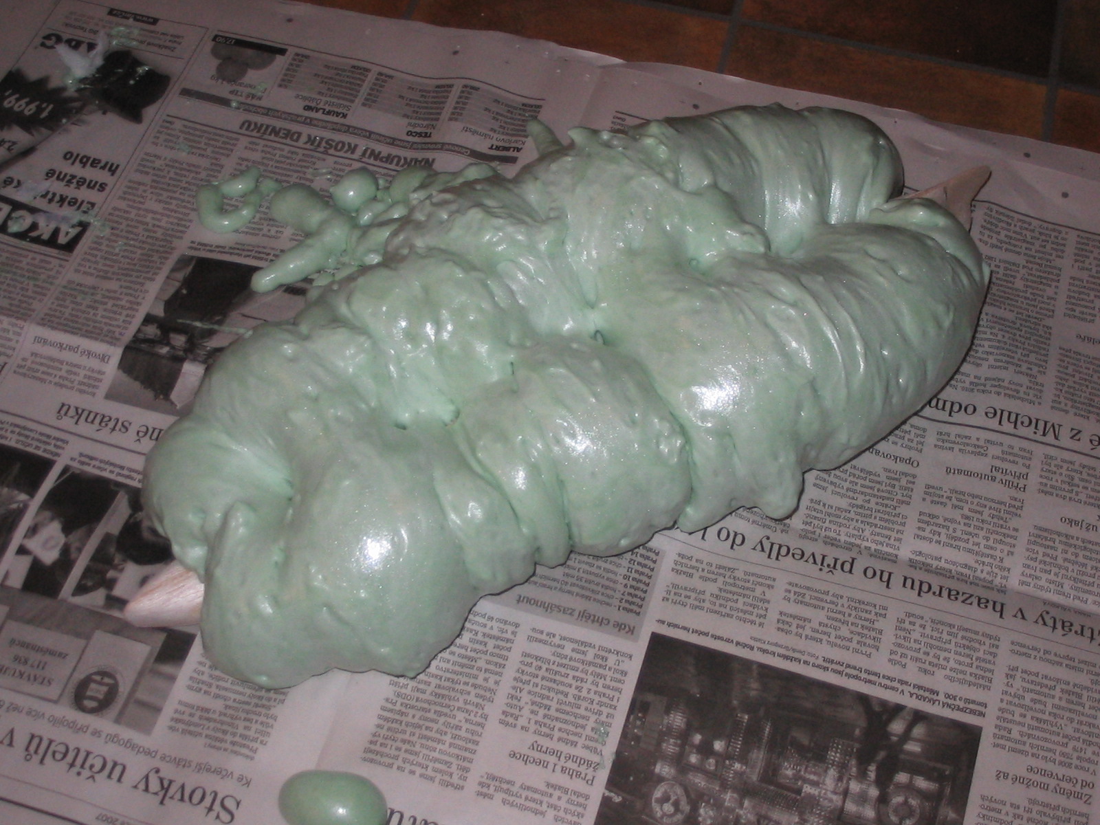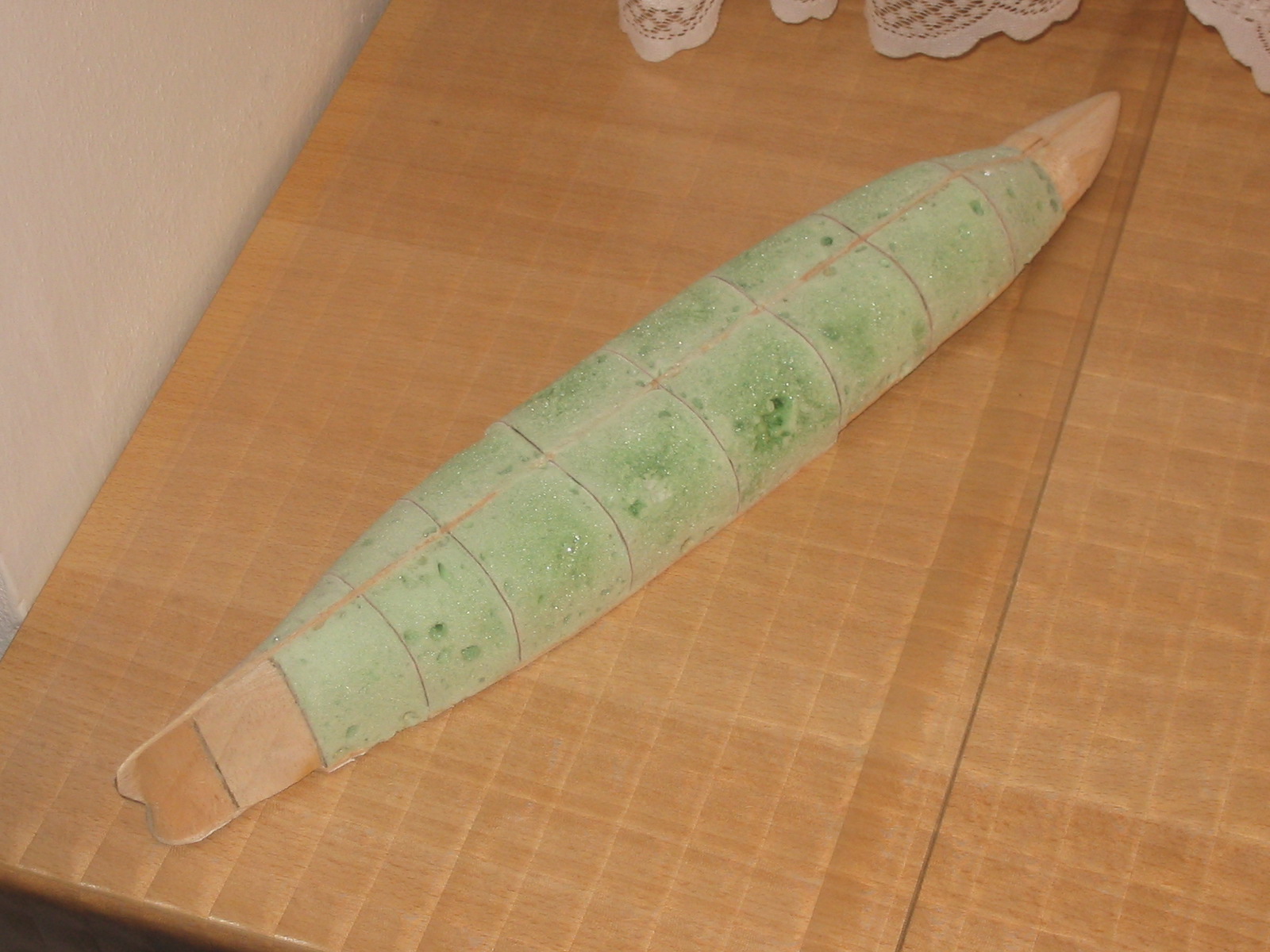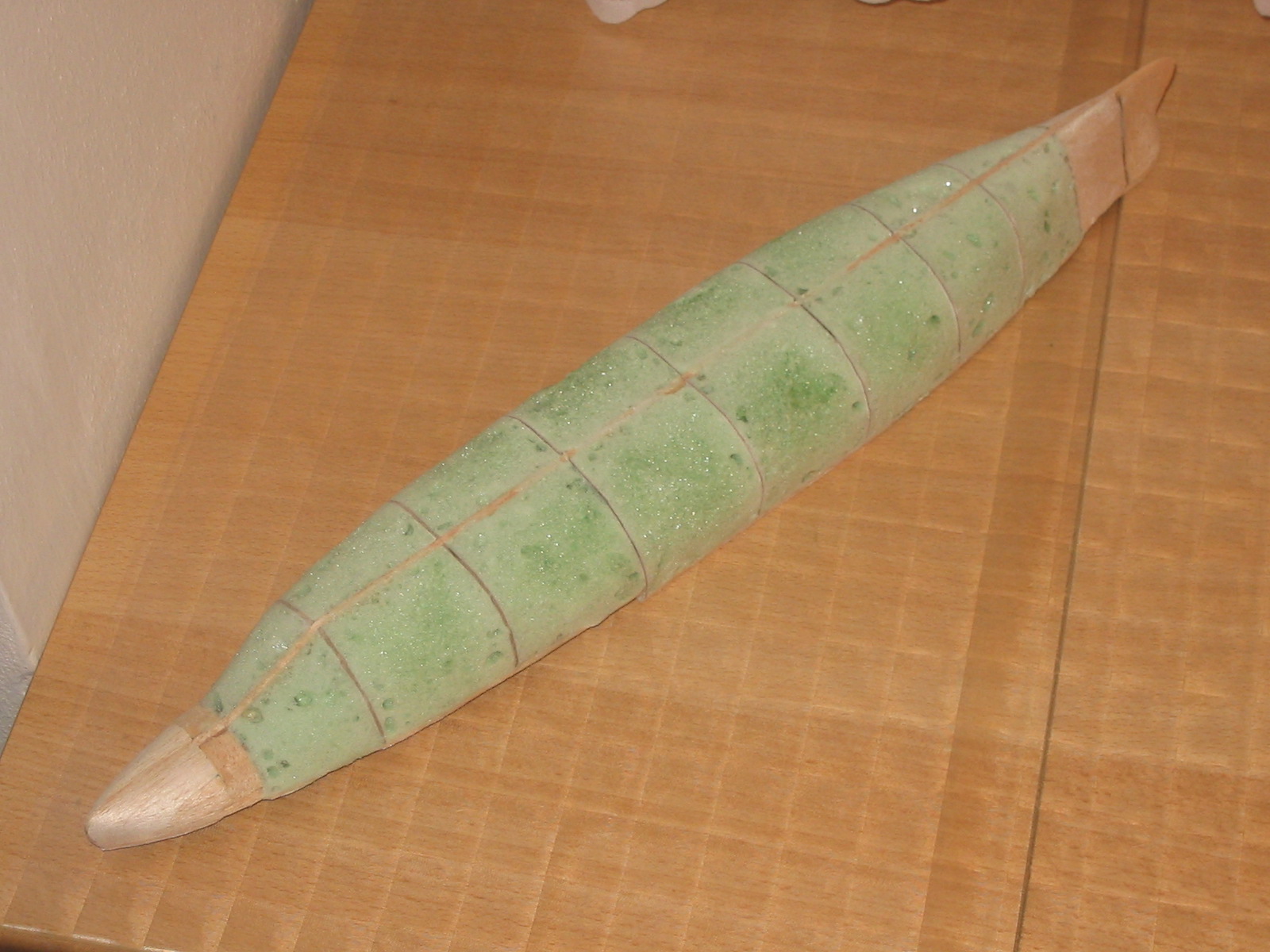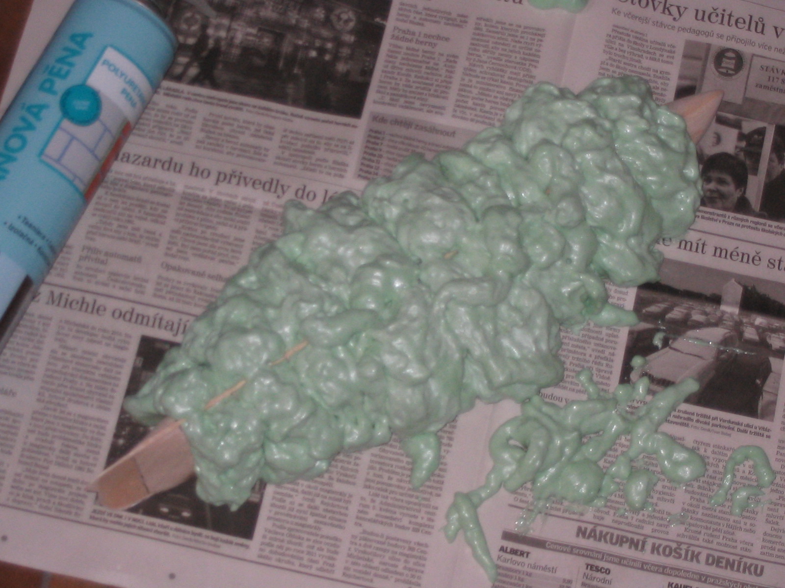 Zajímavou a efektivní technikou je vyplňování kostry trupu pomocí montážní polyuretanové pěny. To co při použití pevného materiálu trvá hodiny, lze takto zrealizovat v pár minutách. Na první pohled velice lákavá představa ovšem i v tomto případě platí, že všechno má svá pro a proti. PU pěna je běžně k dostání v obchodech se stavebními potřebami, drogeriích apod. v podobě sprejů. Její aplikace je velice snadná a rychlá, pěna se prostě nastříká na své místo a nechá ztuhnout. Pěna tuhne působením vzdušné vlhkosti, proto není vhodné ji jakkoli zakrývat. Při aplikaci je dobré dávat pozor na tloušťku vrstvy. Pokud je příliš velká (více než několik cm) tak hrozí, že pěna uvnitř neztuhne a při následném opracování bude dělat potíže (zalepení řezného a brusného nástroje). Větší trupy je tedy lépe vyplňovat na několikrát, anebo pěnu aplikovat pouze po obvodu žeber. Pěna se při tuhnutí značně rozpíná a díky tomu vyvíjí na své okolí určitý tlak. Deformací kostry se však není třeba příliš bát, protože tlaky působící z obou stran přepážky se navzájem vyruší a navíc má pěna možnost expandovat mimo trup do volného prostoru. Vzhledem ke značnému nárůstu objemu je vhodné pěnu aplikovat zdrženlivě, aby se předešlo zbytečnému množství odpadu. Vytvrzená pěna má jemně porézní strukturu, bohužel se však v ní často vyskytují větší bubliny. Jejich přítomnost lze údajně omezit zamačkáním čerstvě zatuhlého povrchu pěny do ještě plastického vnitřku. Jinak lze díry v pěně zaplnit její opakovanou aplikací, menší nerovnosti pak tmelem. Nejvhodnější k tomu je zřejmě tmel šlehaný.