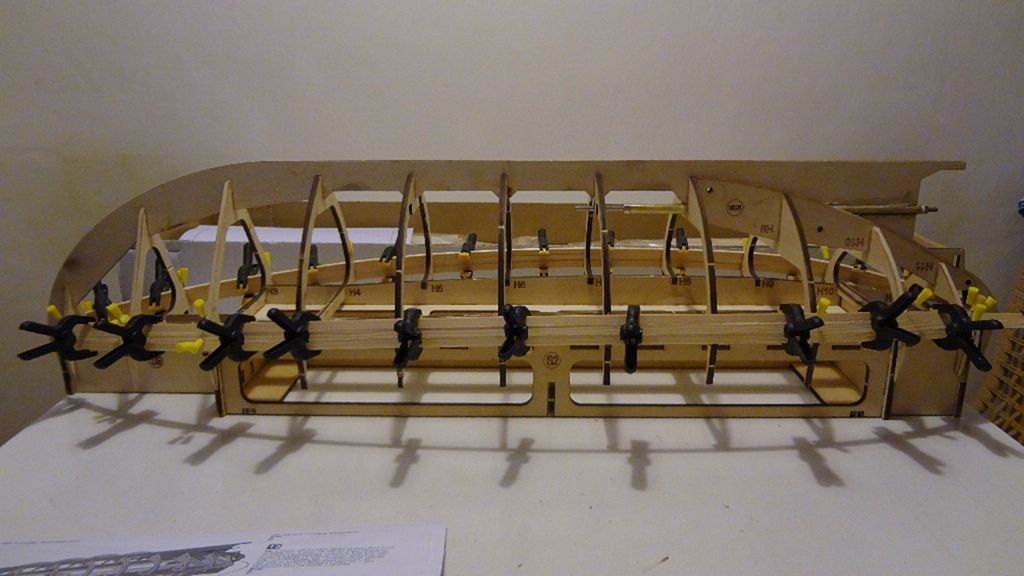Při lepení vteřinovým lepidlem navíc téměř odpadla potřeba používat různé svěrky, lišta prostě drží už chvilku po odvětrání aktivátoru a těch pár vteřin jde vše držet prsty. Jakmile je plaňkování dotaženo k páteři lodi, zbývá lišty odříznout s hranou prvního a předposledního žebra.