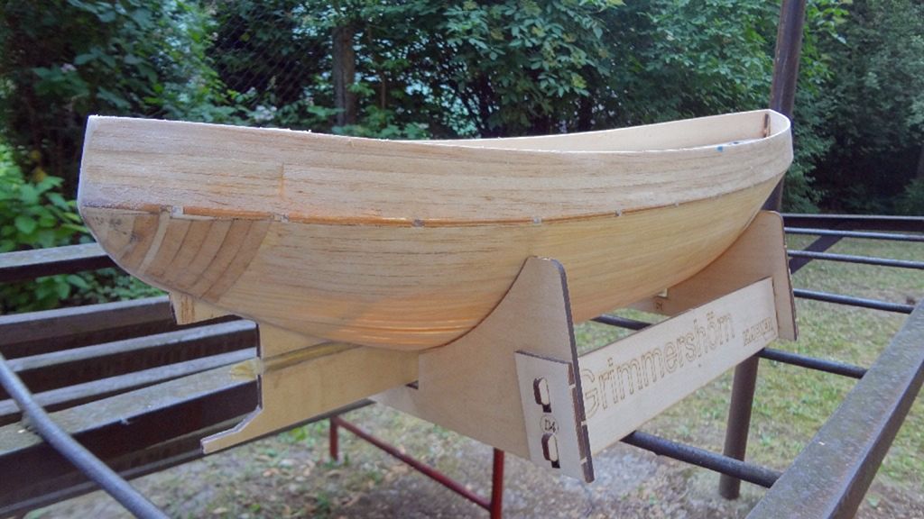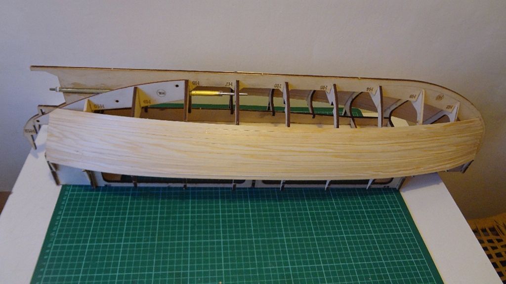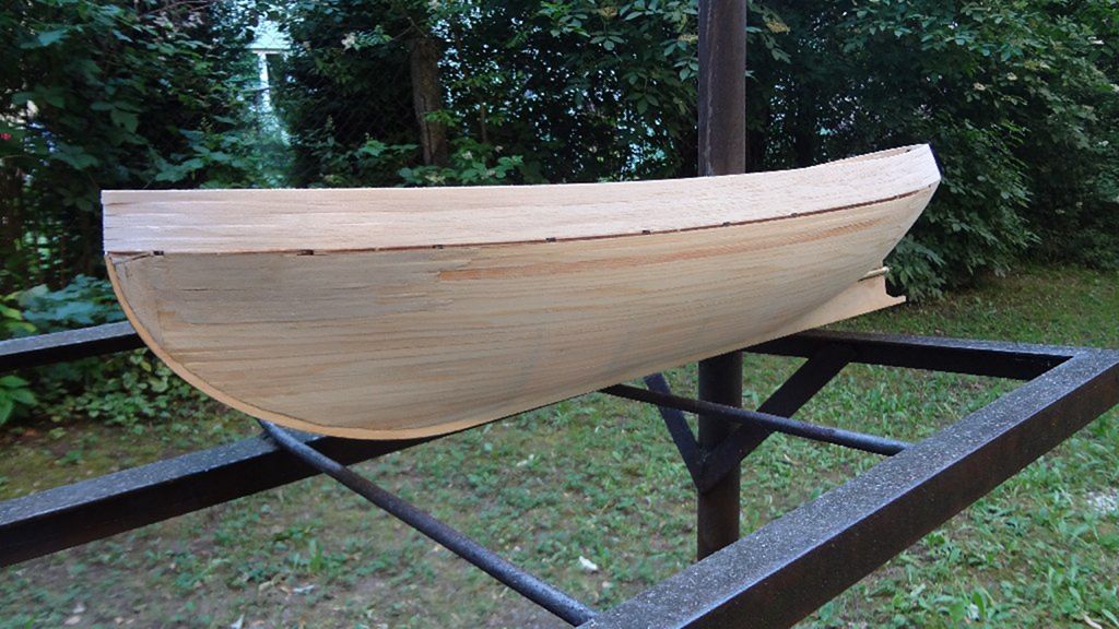 Plaňkování nemá cenu dělat jako pohledové, když je loď barvená, ne lakovaná. Navíc pohledové plaňkování vyžaduje už opravdu zkušenost. Řada lodí měla kladena prkna obšívky ne na sraz (carvel built), ale přes sebe s přesahem (clinker built).