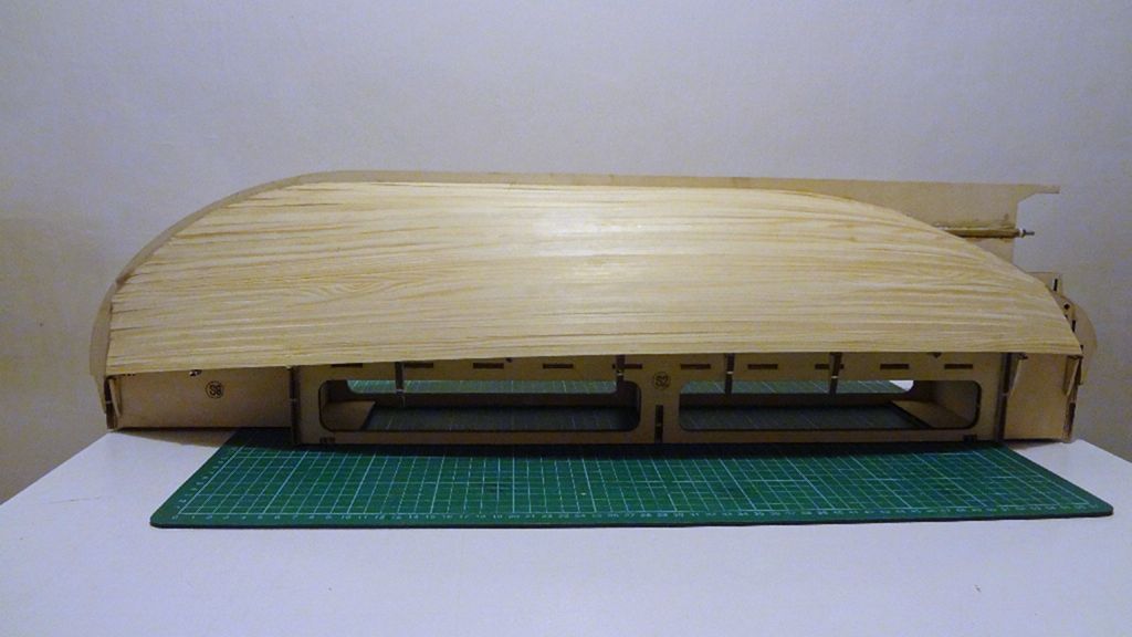 Výrobce dodává smrkové lišty tloušťky 2 mm a šířky 7 mm, ty jdou pěkně ohýbat, tak je ani nenamáčím. Ještě musím uvést, že jsem dosud vždy dával přednost při plaňkování balze, lépe se brousí a trup lodě stejně laminuji. Ale návod je návod… První plaňka se umístí pod bort na připravené výstupky určující její „výšku na žebru“, jen byl problém v tom, že nenamočená lišta se málo prohnula a v místě přídě a zádě vytvořila přímější linii. To by způsobilo komplikaci - později by zde plynule nenavazovala paluba. Proto výrobce doplnil do konstrukce trupu mezi koncová žebra překližkovou „šablonu“, která zajistí tvarovou přesnost.
