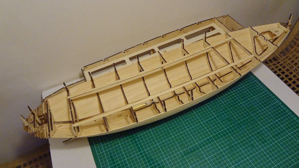 Dalším krokem je nalepení paluby z překližky 3 mm, kde jsou laserem naznačena prkna paluby. Tento díl jsem z obou stran nalakoval. Lepení byl trošku oříšek, paluba má prošlup, a tak přišel opět ke slovu aktivátor a vteřinové lepidlo. Nejprve jsem ale ze spodní paluby odstranil přebroušením barvu z míst, kde budu lepit, potom jsem 5min epoxy přilepil palubu uprostřed okolo rámečku vstupu do podpalubí. Potom jsem postupně lepil „odstávající“ okraje tak, že jsem do mezery mezi palubami nanesl z lahvičky s teflonovou trubičkou „tak akorát“ lepidla, zastříkl aktivátorem a přitisknul. Stisk nesmíme uvolnit příliš brzo, jinak celý postup opakujeme. Na vrchní hranu bortu přijde lem, opět z plastu, který po nástřiku černou barvou postupně lepím vteřinovým lepidlem, plastičnost hmoty dovoluje potřebné vytvarování. Na přídi a zádi díly lemu překryjeme připravenými tvarovkami. Dolepíme plastové úvazníky dvou velikostí a tím můžeme na nějakou dobu trup odložit.