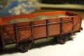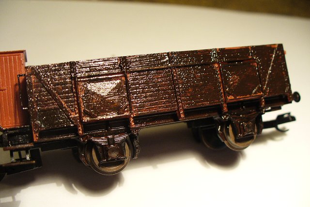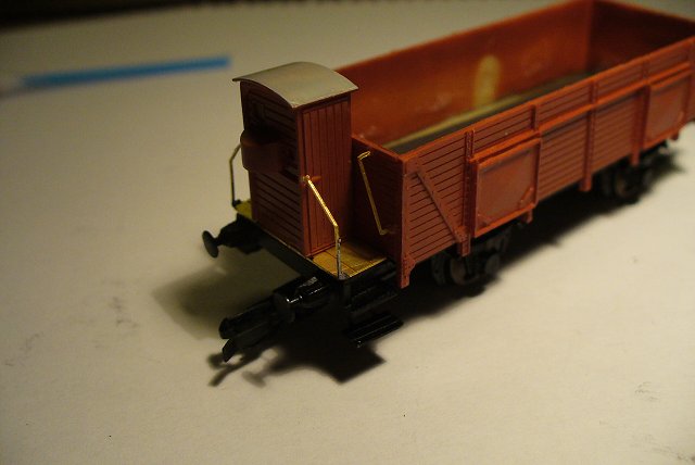 Díly po nástřiku, podvozek polomastnou černou, korba a brzdařská budka červenohnědou vagónovou a dvojkolí lehce rzí.