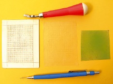 Obdobně dělám i povrch tvořený drobnými kosočtverečky (Šekynovo pojmenování raději neuvádím…). Používám k tomu nejužší rydlo (a jiné pomůcky pro výrobu plátů jsou na obrázku vlevo) ze soupravy pro výrobu linorytů. Možná se dá ještě koupit, já ji mám z bývalé NDR. Čárky ryji do jednotlivých čtverečků sítě (viz obrázek vpravo). Všimněte si na fotografii, jak je paluba časem ochozená. Pokud jde o povrch vyrobený svářečkovou metodou, postupem času a v důsledku koroze jsou na povrchu důlky a ne hrbolky. Jako matrici pro zhotovení plechů lze použít i plochý pilník, pletivo ze sítí proti hmyzu a jiné. Můžete také vzít tiskařskou fólii a tupou jehlou na podložce z výstražné tabulky ty hrbolky pěkně jeden po druhém vytlačit. Zjednodušíte si to ozubeným kolečkem s vyhovujícím modulem.