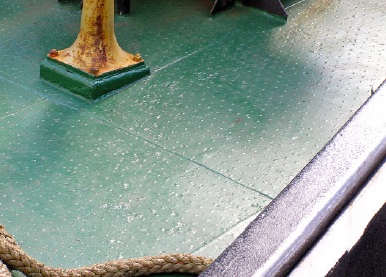 K prvnímu typu, hladkému povrchu, není co říci. „Ryflovaný“ povrch (český termín mi není znám) se používá většinou na schody a požární plošiny, ale viděl jsem z tohoto materiálu svařené i opláštění palubního jeřábku. Jde o souvislé čáry vedené plátem na koso. Na polských lodích se ale nejčastěji setkáte s „kroplovaným“ povrchem. Co to je? Dříve si pracovník stocznie vzal štokrle a elektrickou svářečku a tou na hladkém povrchu dělal pokud možno pravidelně něco jako kopřivku velikosti asi poloviny hrášku. Dnes je tento postup nahrazen válcováním a výsledkem jsou pravidelné řady bobků po celém povrchu. Velký učitel Šekyn tomu říká „bradavkový plech“.