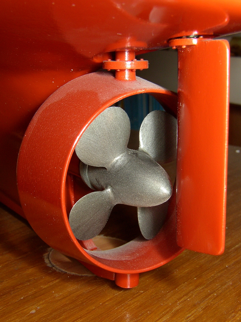 Pohon obstarává starý Mabuchi 550 s převodovkou Horst, původně převod 1:4 a něco, nyní 1:3. Hřídel je ze 4mm svářecího drátu, toho nerez s mosaznými futry. Mazáno - potravinářská vazelína + na konci, co je ve vodě, nějaký „špeciál“ od kamaráda Karla. (Ten mi také zajistil docela bezchybnou vlajku. Sice jsme ji věšeli až v Pirně před hodnocením, ale je stejná jako ten origoš, co mám doma.) Zdroj je pětičlánek NiCd 7,2 V/2700 mAh + čtyřčlánek 800 mAh pro kormidelní servo a přijímač. Regulátor je, světe div se, starý dobrý „Zlatý Hitec“ vytažený ze Snowberry, která je již na odpočinku. Protože přístup do trupu je víc než obtížný, nabíjím vše v lodi.