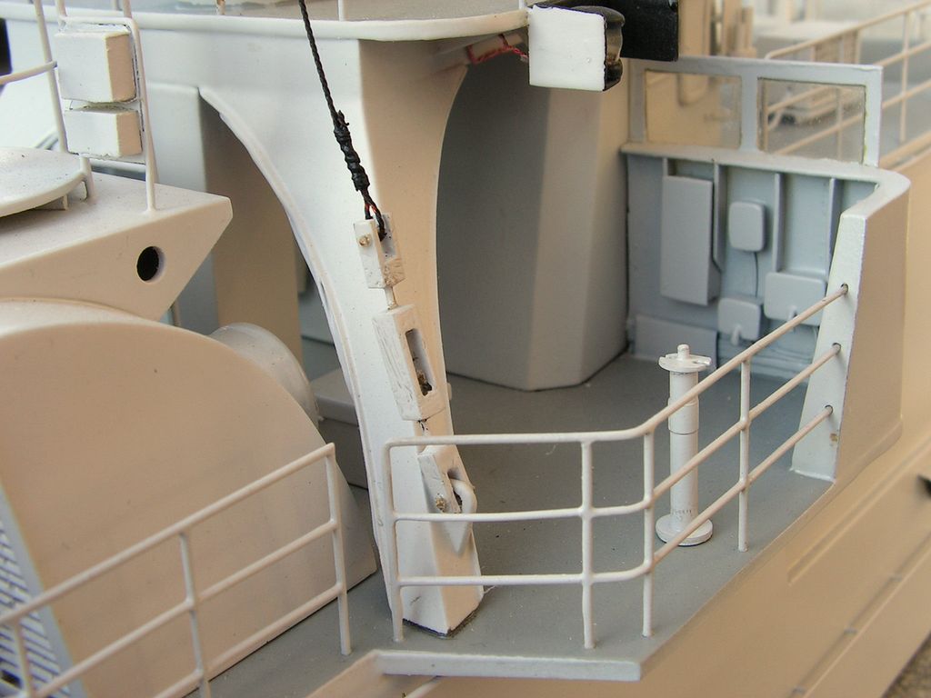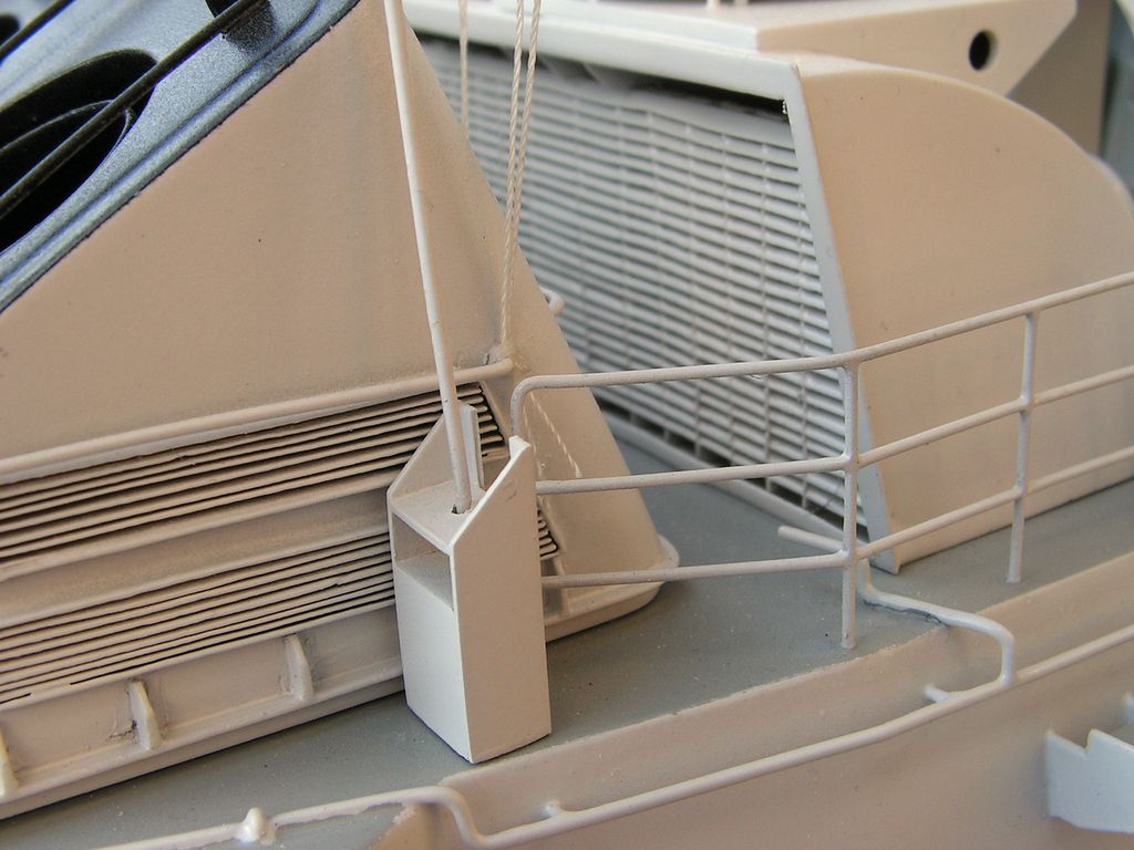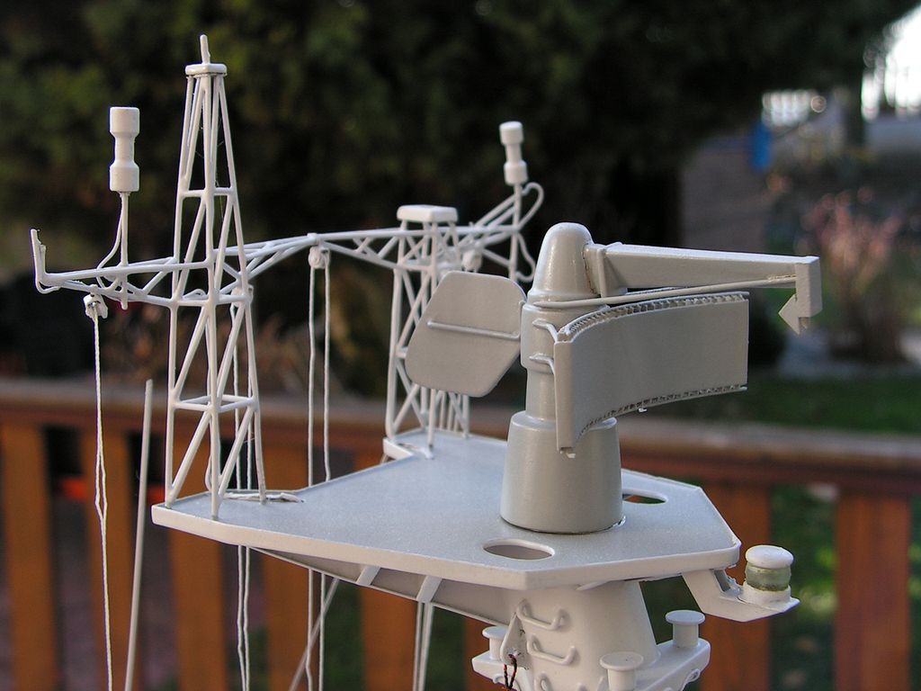 Základna stožáru je opět z laminátových desek 0,76 mm. Samotný stožár je vybroušený z extrudovaného polystyrenu podle šablon, olaminovaný třemi vrstvami tkaniny cca 80 g. Po olaminování jsem polystyren odleptal pro jednodušší protažení kabelů pozičních světel. Horní platforma je z kombinace laminátových desek 0,76 a 0,2 mm. Vyhledávací radar „garpun“ má tělo vysoustružené ve vrtačce z násady od smetáku a parabolu slepenou na šabloně z pásků laminátu 0,2 mm.