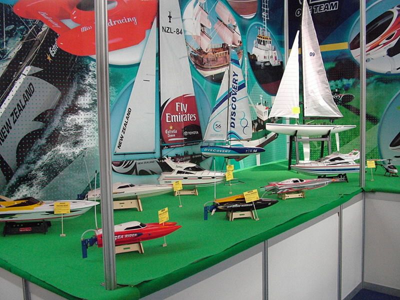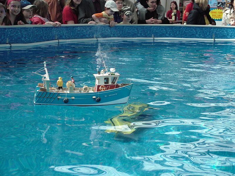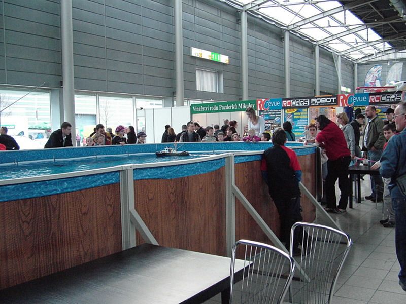 V pátek jsme se na tomto bazénu pokusili o ježdění s modely Mini Eco (Blechy), ale jak jsem dopředu varoval pořadatele i stavitele bazénu, folie na tomto bazénu je opravdu tenká i pro plastové šrouby. Po „zhotovení“ asi 4 trhlin na této folii ubyly cca 3 cm vody. Stále přítomný pracovník dodavatelské firmy díry zalepil a uklízecí služba vytřela kaluže kolem bazénu. V tuto dobu byl mezi námi Zdeněk Sládek (Čaroděj) a na jeho návrh byla po obvodu hladiny upevněna hadice. Pak již předvádění lodí proběhlo bez komplikací až do konce veletrhu.