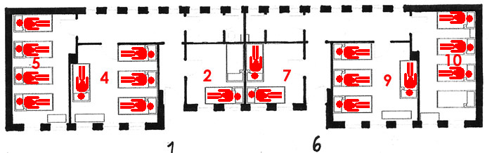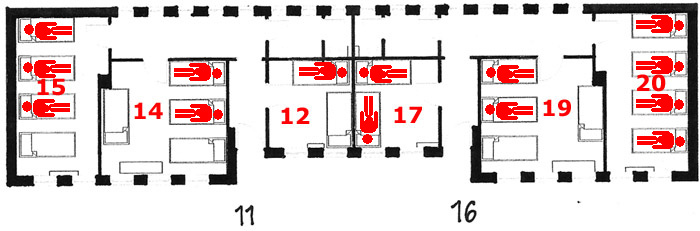 Každý vchod má společné 1xWC a 2xumyvadlo (studená voda). Sprchy a teplá voda jsou k dispozici