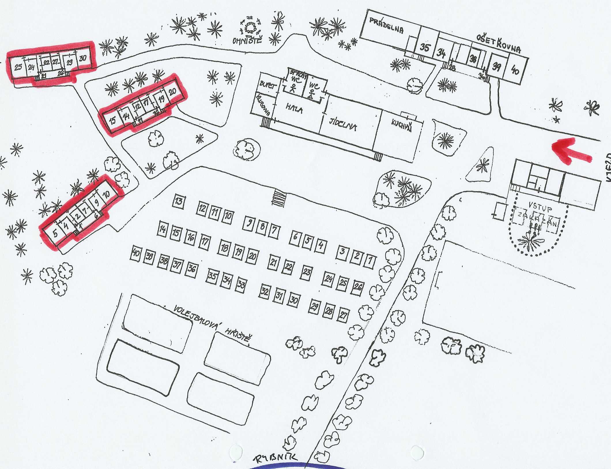 ubytování ve třech zděných chatách, které jsou v plánku červeně orámovány.