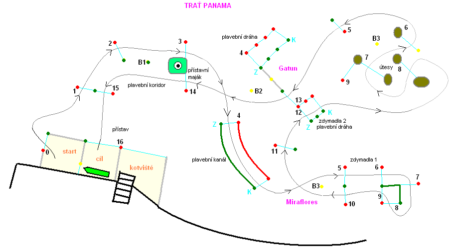 se remorkéry nesmí dotknou vjezdových majáků, které tvoří branku 0. Spulodí postupně propluje brankami 1,
