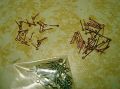 Srovnání výsledku: dole v sáčku nevyhovující náhradní očka od Constructa, vpravo očka ze stavebnice Granada, vlevo vyrobená očka. Nejvýraznějším rozdílem je křivá nožička, která ale stejně slouží jen k přidržení při barvení a je celá zapuštěná (zalepená) v podkladu. Výroba jednoho očka trvá asi minutu (10 oček 10'18").
