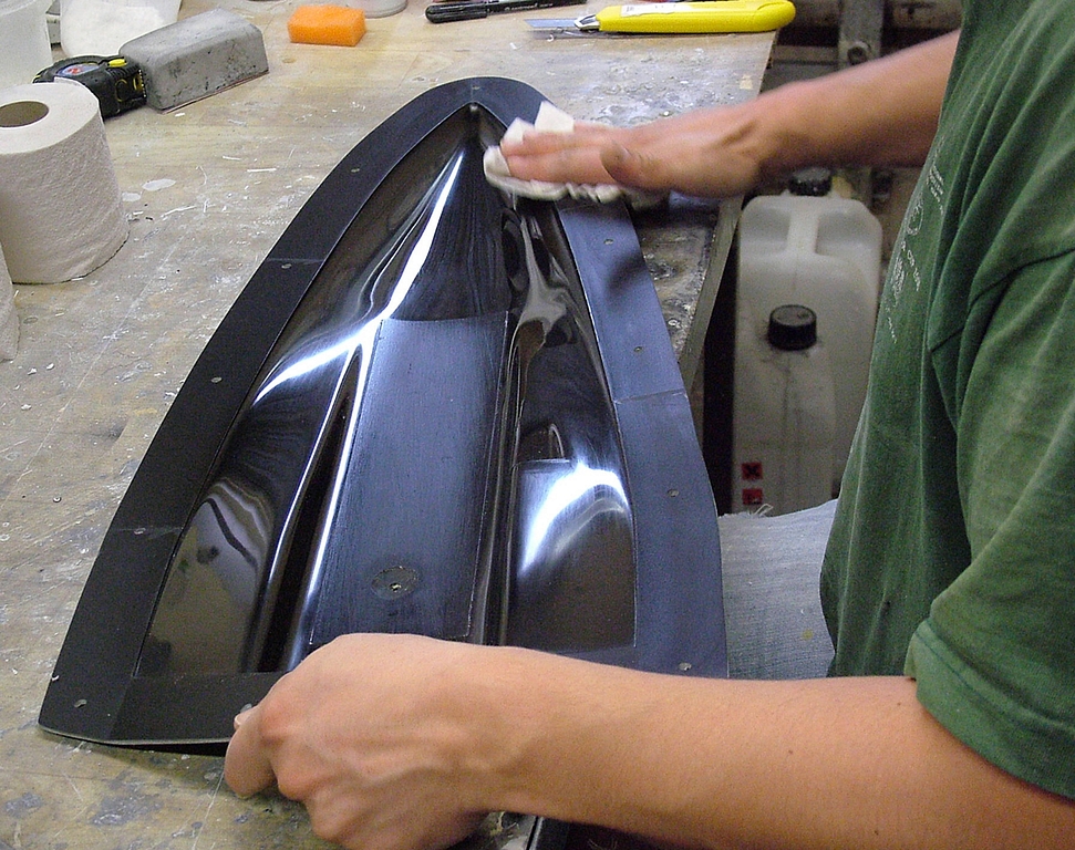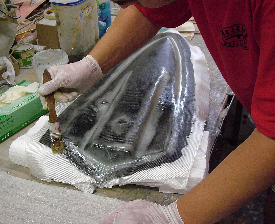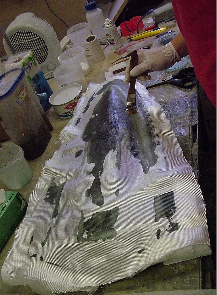 Vlastní forma je vytvářena ručním kladením jednotlivých vrstev. Jednotlivé vrstvy výztuže jsou štětcem prosycovány iniciovanou pryskyřicí. Jako laminační pryskyřice je použit Epoxid L285 míchaný v poměru 100:40 hmotnostní poměr (objemově to je 100:47, funguje ale i 100:50) a jeho cena je 700 Kč/kg.