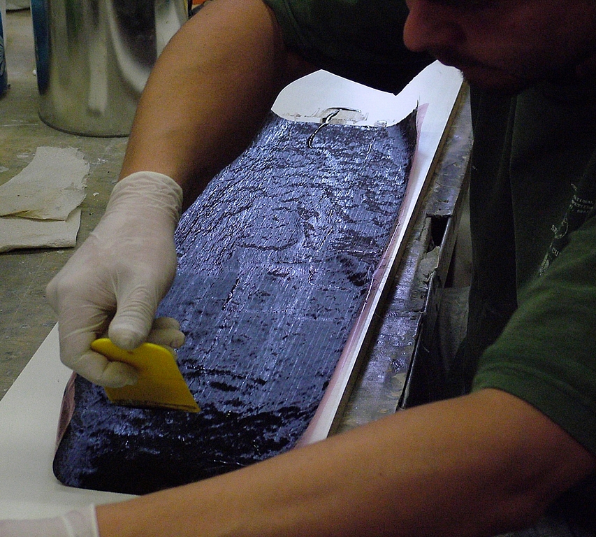 Jako první, se důkladně vymažou všechny hrany formy zahuštěnkou. Tím jednak zpevníme hrany na výsledném výrobku. Ale také si tím zjednodušíme kladení tkaniny, která by se nám do těchto rohů nedostala a pokud by se zde vytvořila vzduchová bublina, velice snadno by se daný roh ulomil. 80 g/m2 skelnou tkaninu budeme mít nachystanou tak, abychom ji mohly nanést v jednom kuse do formy, a pak ji důkladně prosytíme iniciovanou epoxidovou pryskyřicí. Zkušenosti zhotovitele se odrazí na množství použitého epoxidu a výsledné hmotnosti celého produktu. Dále musí zhotovitel dbát na to, aby se mu nevytvářely pod tkaninou vzduchové bublinky, které by celý výrobek znehodnotily.