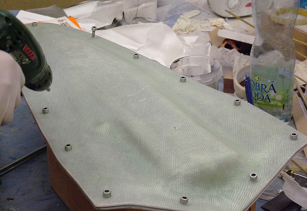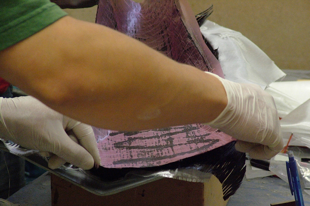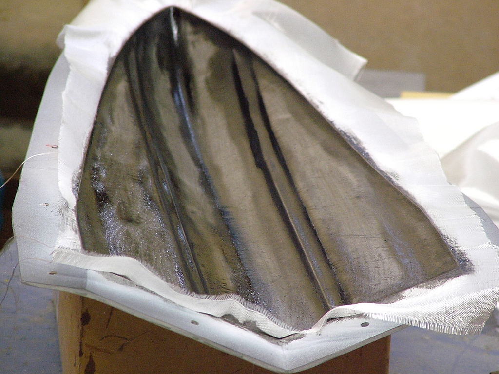 Po této vrstvě jsou naneseny další dvě vrstvy skelné tkaniny a opět řádně prosyceny epoxidem. Následně jsou odstraněny přečnívající tkaniny přez hranu formy a je provedena kontrola zda se ještě neobjevily vzduchové bublinky. Ty je nutno z vrstev tkaniny vytlačit.