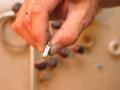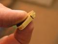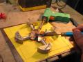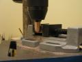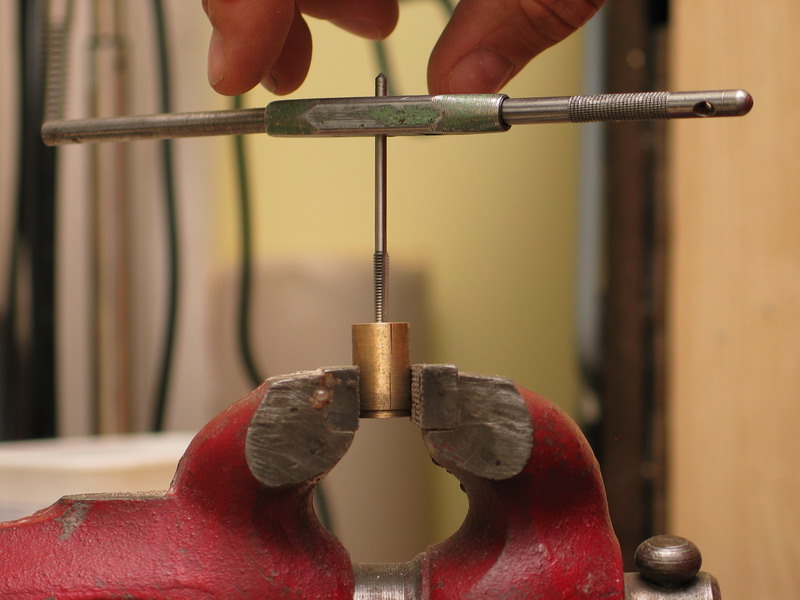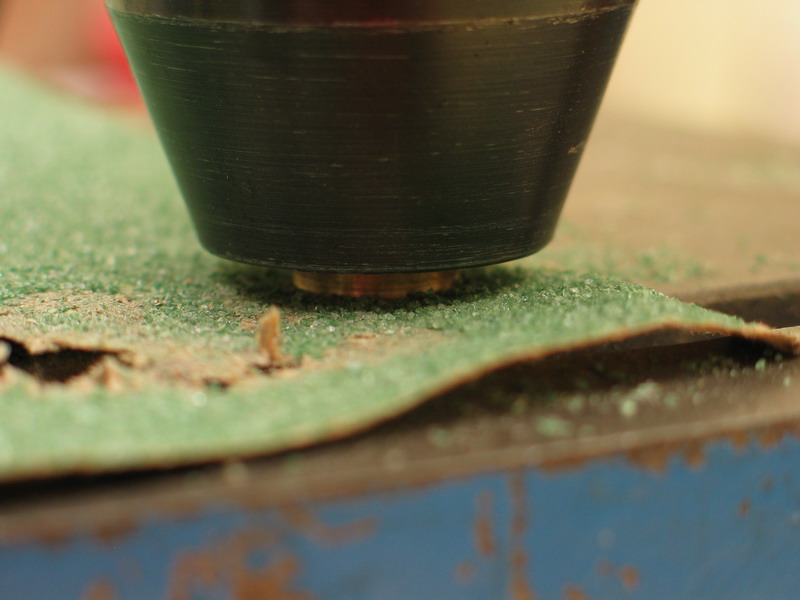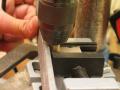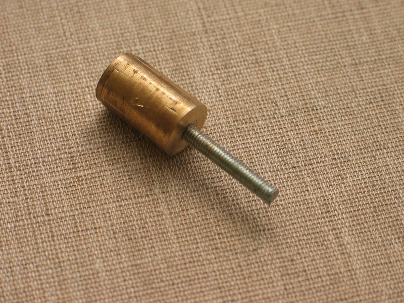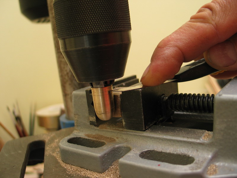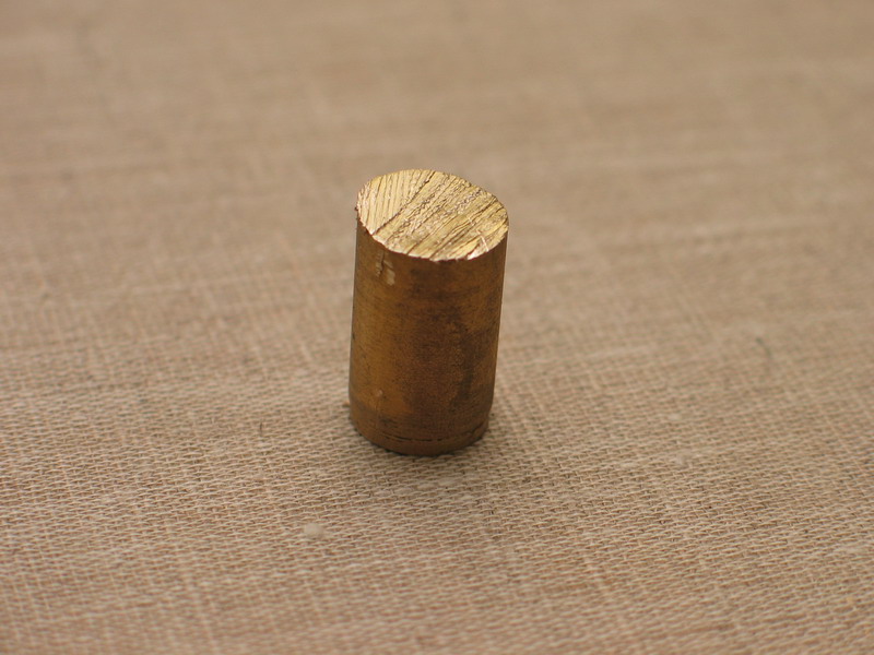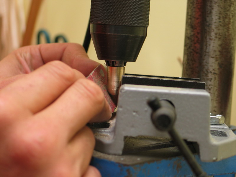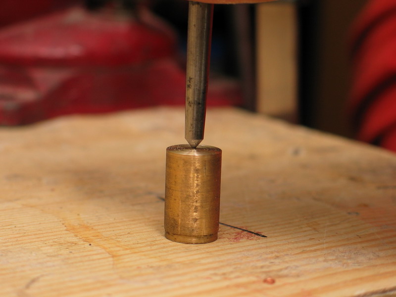 Co je k tomu potřeba. Kousek mosazné kulatiny, vrták, závitník a pilník s 1-kovým či 2-kovým sekem (hodně hrubý), nějaký jemnější pilník, smirky různé hrubosti a samozřejmě vrtačka (nejlépe stojanová). Začneme s tím, že nejprve uříznete potřebný kus kulatiny (obr. 1). Kulatinu upneme do sklíčidla stojanové vrtačky (obr. 2). Na pracovní desku položíme smirek a mírným tlakem obrousíme obě čelní strany kulatiny, tím je zarovnáme (obr. 3). Používáme co nejhrubší smirek (zrnitost tak 60), následně můžeme čela začistit jemnějším smirkem. Tím máme připravený polotovar pro další práci. Pokud si všimnete, tak máte na čelech vybroušené kruhy včetně naznačeného středu od smirku (obr 4). Toho využijeme k vyvrtání díry pro hřídel. Důlčikem naznačíme střed (obr. 5). Obrobek upneme do svěráku. Je dobré ho opřít o spodní část svěráku, tím udržíme pravoúhlost (nebo se alespoň přiblížíme ideálu). Pokud máme předvrtávák, tak ho využijeme (obr. 6). Následně zaměníme za vrták a díru dovrtáme (obr. 7). Dokončíme práci závitníkem požadované velikosti (obr. 8). Zašroubujeme šroub do náboje a odstraníme u něj hlavičku (délku volíme tak, aby dosedl na dno sklíčidla u vrtačky) - obr. 9.