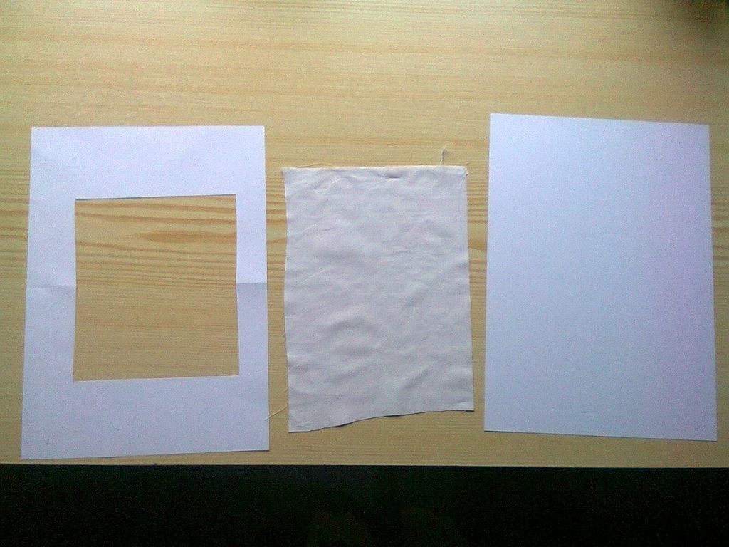 Do prvního papíru jsem vystřihl čtverec. Prázdné místo jsem vyplnil batistem (musí být napnutý) a zespodu jsem přilepil neporušený papír.