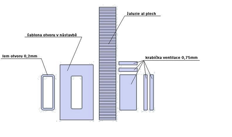 Jako materiál jsem zvolil laminátovou desku 0,75 mm na dno krabičky, laminát 0,2 mm na vnější lem, HPS 0,5 mm na boky a hliníkový plech na žaluzie.