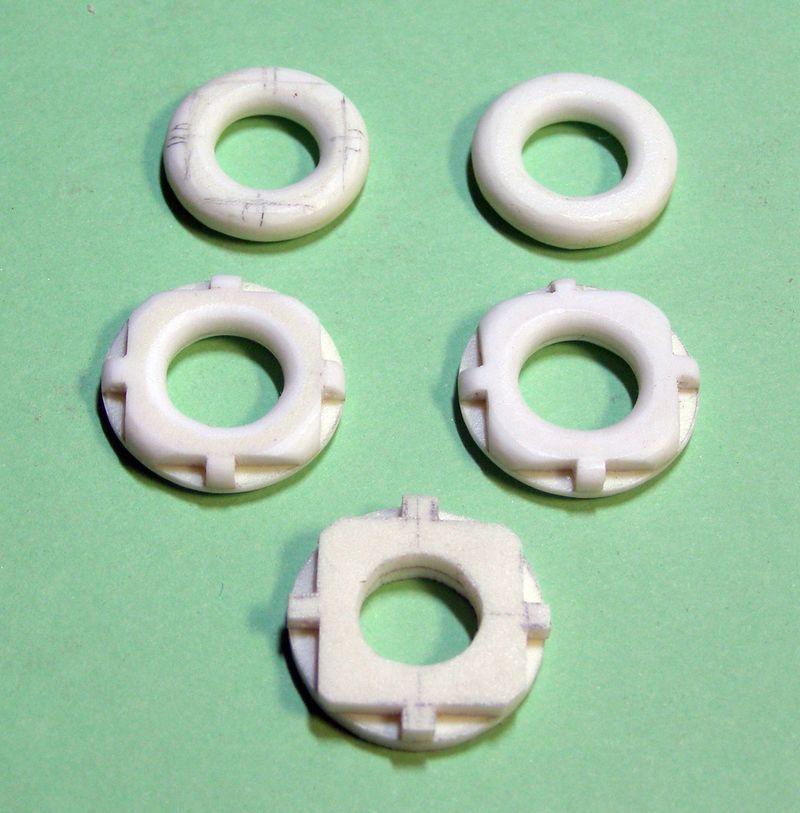 Na Stražaku 14 jsou vidět a i v plánu uvedeny 4 kusy záchranách kruhů. Takže kdysi dávno jsem udělal pěkně 4 holá kolečka podle plánu a odložil je do krabičky. Pak jsem se po dlouhé době dostal snad již opravdu do závěrečné fáze a přišla řada i na kruhy. Ke své hrůze jsem, ale zjisti, že na fotografiích, podle kterých stavím a doplňuji původní plán, jsou již kruhy nové. Žádný obandážovaný korek, ale umělohmotný výlisek. Takže jsem musel opět na začátek a vyrábět znovu.