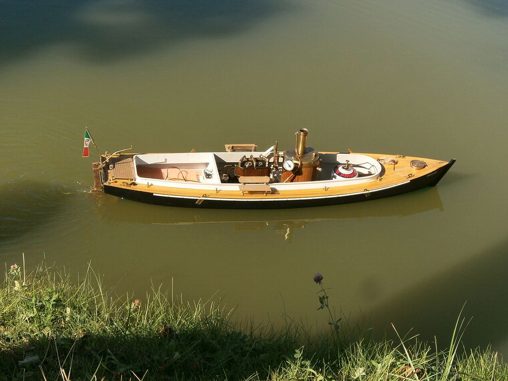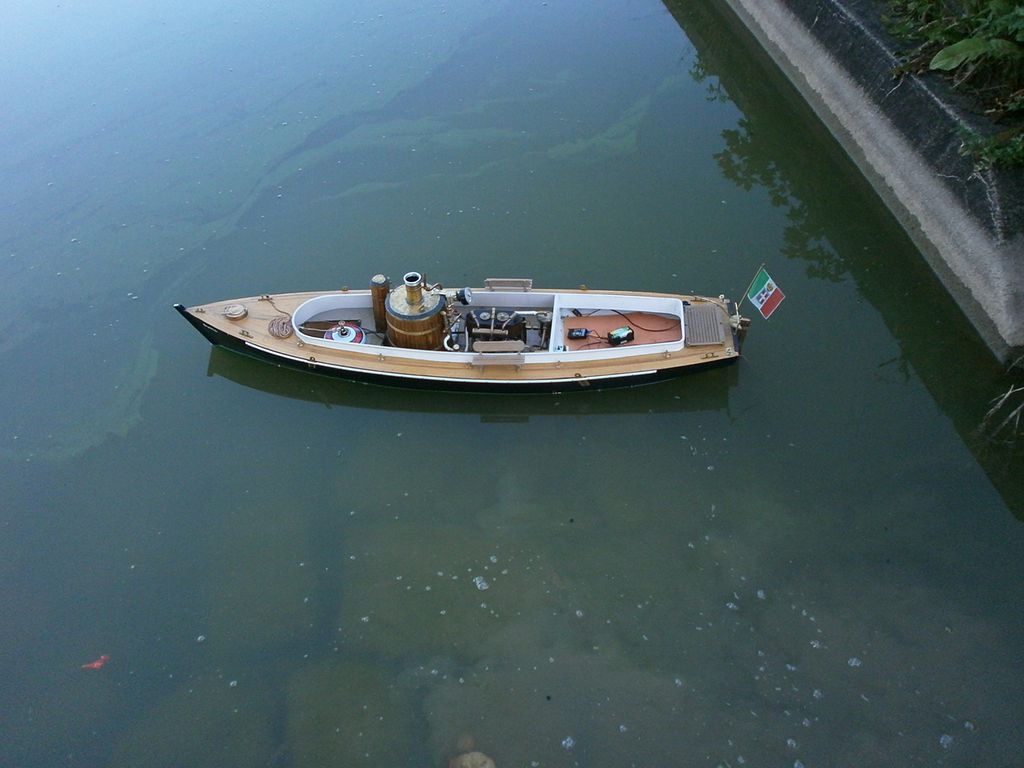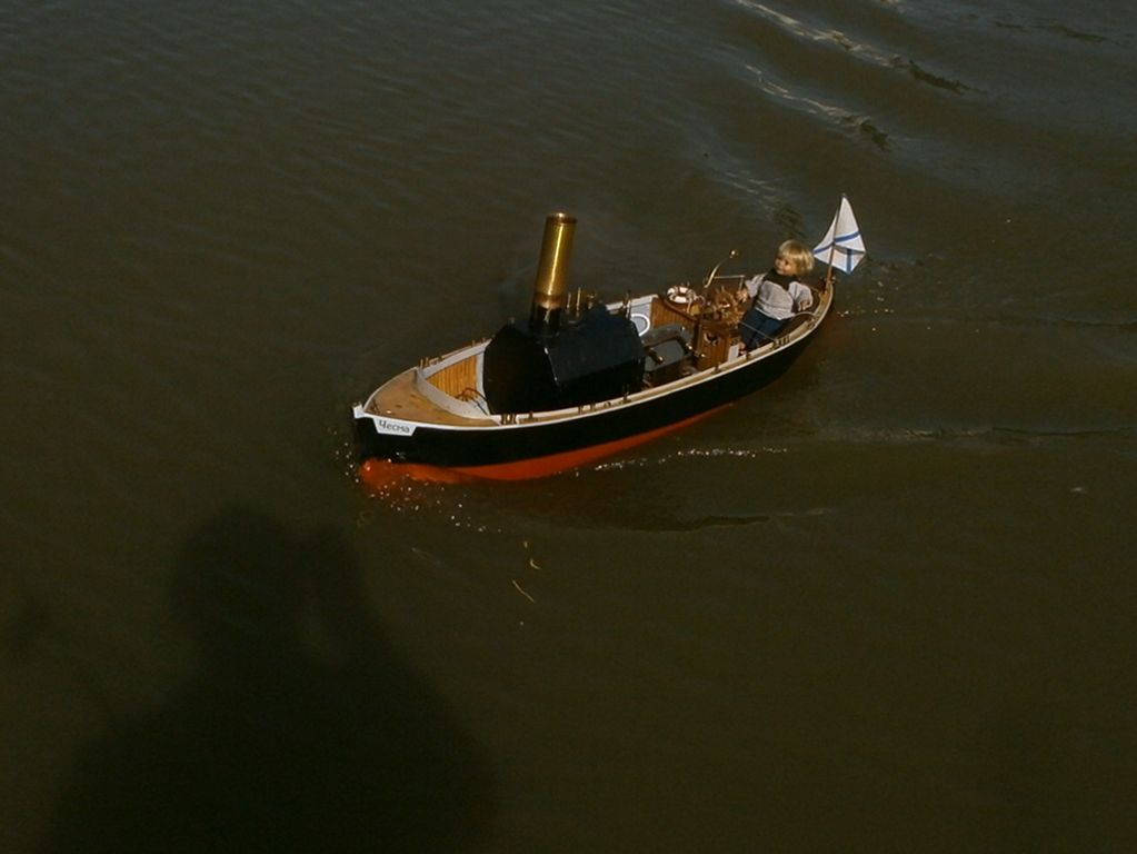 Ale to nebylo všechno, tato loď vystřídala asi 4 strojky: oscilační 2x16/24, šoupátkový 2x15/20, šoupátkový 2x18/24 a nakonec šoupátkový 2x16/24 z lodě Duilio. Vždycky všechno rozebrat, přeházet, znovu spojit - stálo mně to asi 2 metry Cu trubiček na propojení a půl kila cínu, ale plave to docela dobře. Nejlépe se strojkem 2x18/24, ale ten jsem dal zase do lodi Duilio - s touhle lodí budu na Vyžlovce „dýchat“ na záda Mírovi Šrámkovi s Renownem.