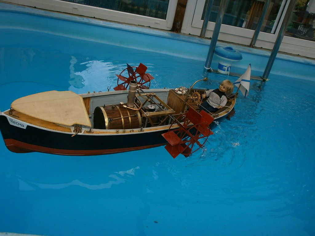 Ale to nestačilo - vzal jsem její starý oscilační strojek a přidal mu kuželový převod a řetízek vzhůru na hřídel koles a byla z toho docela dobrá strojovna též - viz obrázek v bazénu... Nemám obrázky na rybníku, ale určitě by to plavalo i tam.