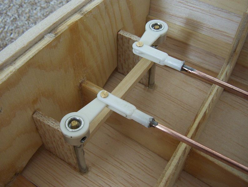 SH: Táhla jsou ze svařovacího drátu, umístění serva v pohodě - mám tam udělané kryty hřídeli, jen nejsou ještě na fotkách. Servo je rychle demontovatelné. Ale stejně je díky úzkému tvaru do trupu přístup jak k penězům. Pozdra kormidel mají na koncích ''objímky'' vyrobené z podložek stejného vnitřního průměru ( taky ještě nejsou na fotkách ).