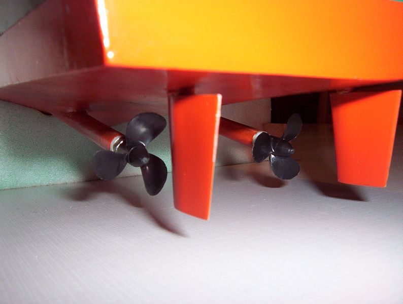 Hrubá stavba trupu je hotová a tak jsem se rozhodl zalepit do trupu hřídele, kormidla, a protože jsem hodlal udělat vodní chlazení, tak i jeho výstupy. Začal jsem chladícími otvory. Stejně jako originál, tak i můj koráb je má na zádi. Podle plánu jsem vyměřil jejich polohu a nahrubo vyvrtal otvory. Poté jsem jehlovým pilníkem přesně dopiloval dírky na požadovaný průměr.