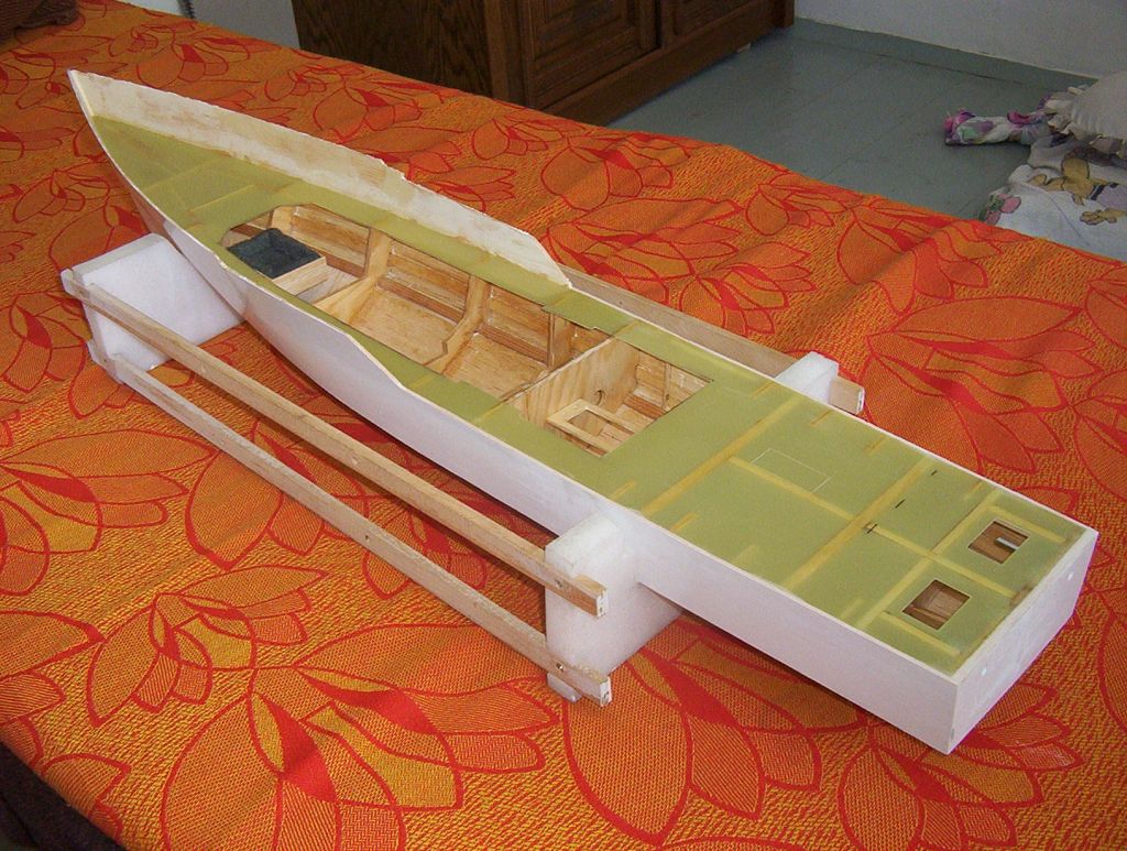Po zaschnutí přetmelit a přebrousit spáry, slícovat je do roviny a mohl jsem vyrobit límec. Ten je opět z laminátu, z pásků asi 1cm širokých. Postupně jsem je vlepoval z vnitřní stravy otvoru a celý jej tak obešel dokola. Pro zvetšení lepené plochy ( při nasazování kabiny bude límec přece jenom namáhán ) jsou spoje podlepeny smrkovou lištou a úhly zality epoxidem. Nyní jsem považoval celou palubu za hotovou a vrhnul jsem se na bort. Před vlastním utvářením bortu bylo nutné udělat jeho vzpěry. Ze všeho nejdříve jsem si podle plánu překreslil na palubu jejich rozmístění a na tyto místa vlepil podstavce vzpěr, malé laminátové obdélníčky.