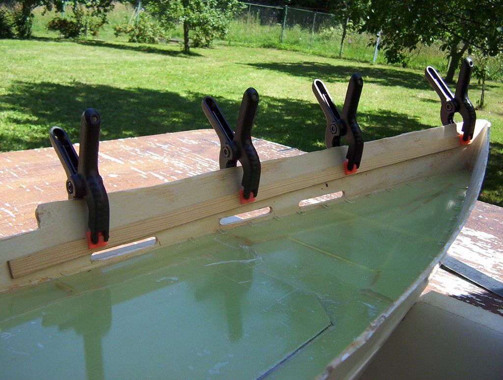 Když byly otvory hotovy, tak jsem zdrsnil a na svá místa vlepil vzpěry, opět epoxidem. Po zaschnutí epoxidu jsem bort nahrubo obřízl podle vzpěr a pak přesně zapiloval do roviny s hranami vzpěr. Z laminátu jsem si připravil „obdélníky“ ve tvaru vrchní části bortu s přesahem. Tyto jsem pak postupně epoxidem lepil ke vzpěrám a dolní části bortu. Když bylo vše na svém místě, tak jsem vzal desku s nalepeným šmirglem a zarovnal jsem nejdřív spoj dvou částí a pak vrchní hranu. Tak aby byla zarovno se vzpěrami.