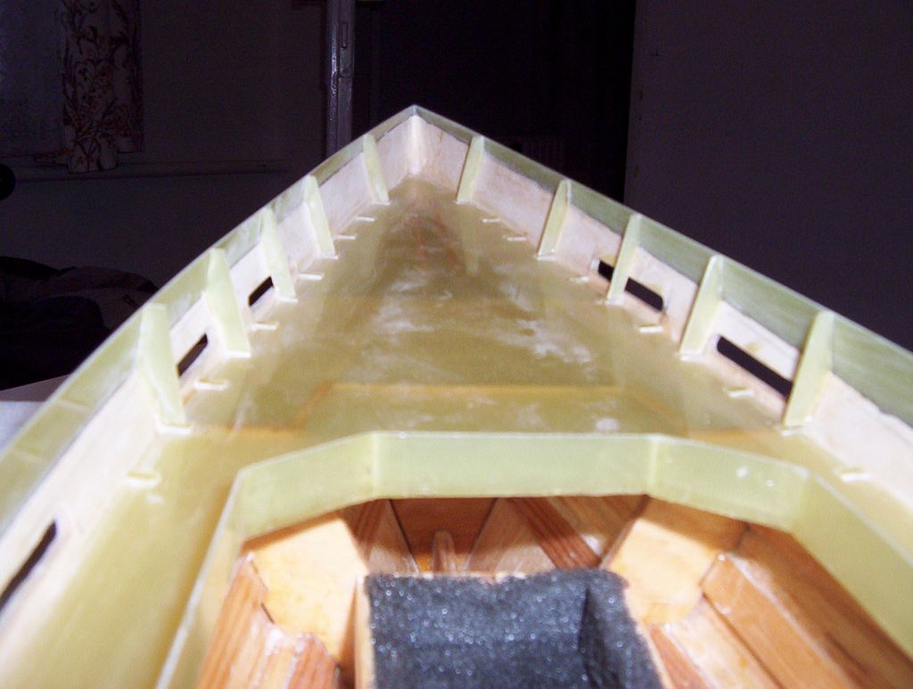 Ještě před samotným vlepením bylo ale nutno udělat něco, na co bych palubu přilepil. Samotné žebra se ukázaly jako nedostačující a paluba se prohýbala. Proto jsem na zádi a na přídi, kde už nezasahoval středový otvor, udělal jakýsi rošt ze smrkovích hranolků, který palubu podpírá.