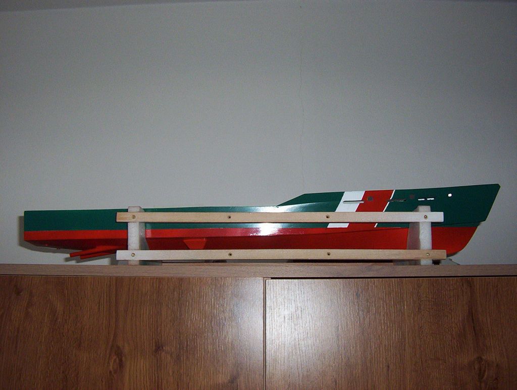 Opět jsem trup lehce přebrousil P800 a dal druhou vrstvu. Posléze přišla na řadu zelená, přesně „zelená friska“. Trup jsem zamaskoval maskovací páskou a dal mu zelený kabátek. Opět dvě, tři vrstvy, jak kde. Teď zamaskovat a stříknout pruhy na boku, nejprve bílou a pak do barvy. Nyní už zbývá jen dno na červeno, odstín „červená paprika“. Vše bez výraznějších komplikací s mi sympatickým výsledkem. Jen jsem musel občas některá místa poopravit a stříknout vícekrát. Nakonec až bylo hotovo, jsem palubu přebrousil P1000 pod vodou a pěkně jí vyhladil.