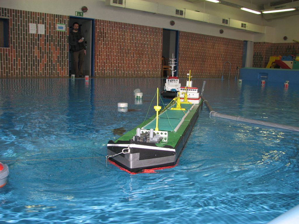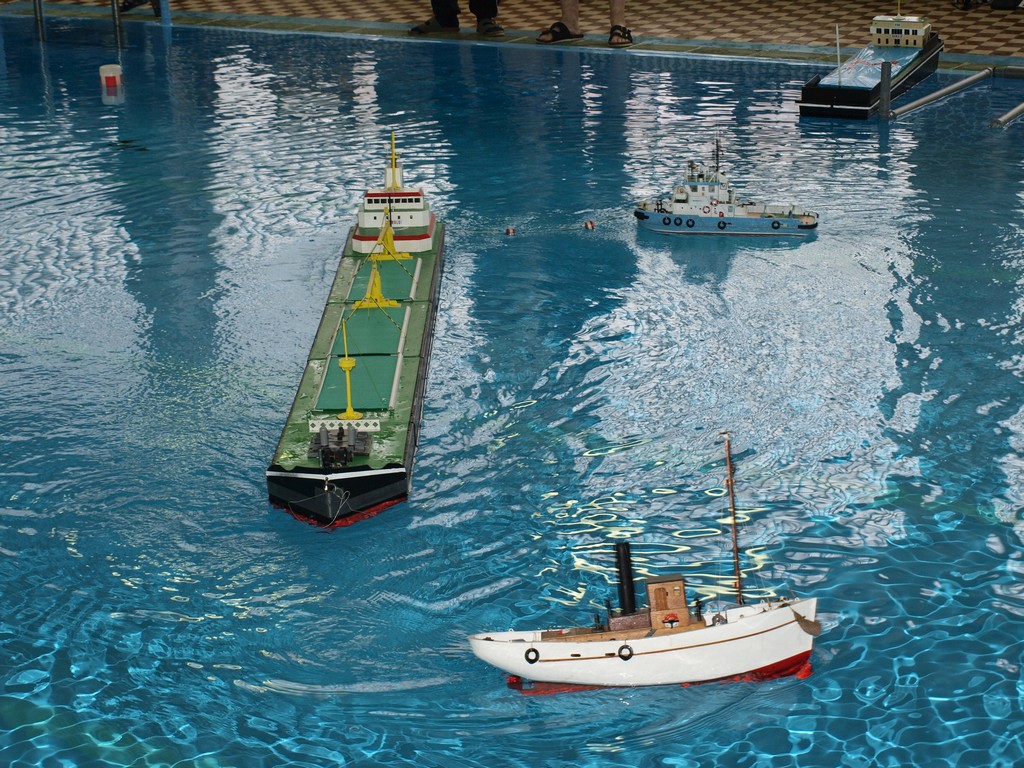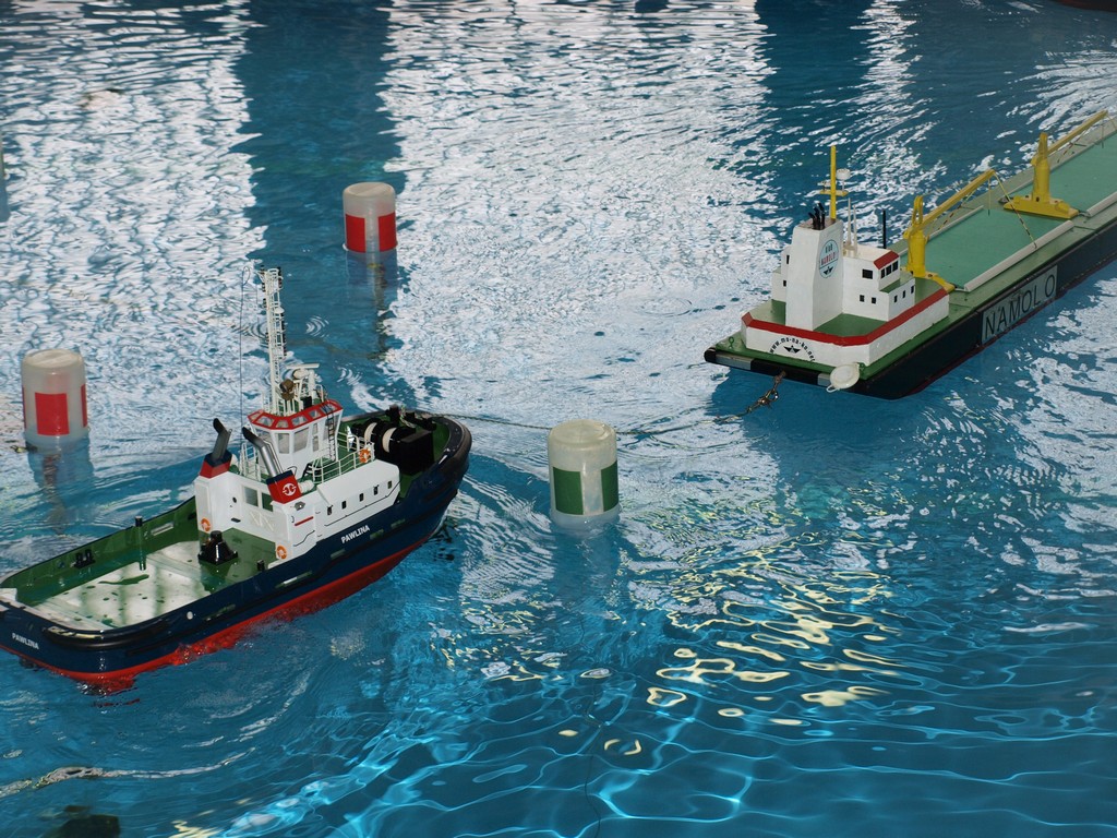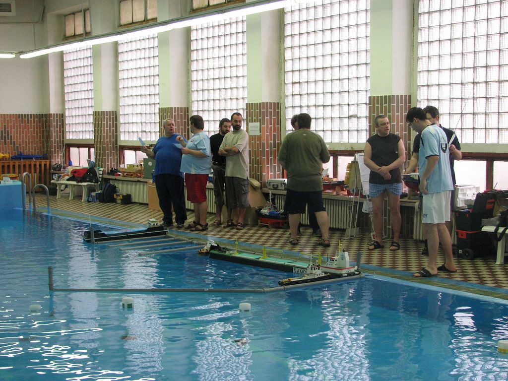 Náš příjezd se mírně opozdil, ale stavba tratě proběhla rychle a hladce. Ladous se statečně vhroutil do bazénu, kde rozmisťoval jednotlivé bójky a branky. Na trénink si mohlo každé družstvo na pět minut zapřáhnout vlek a vyzkoušet si některé manévry. Hlavního rozhodčího dělal Bambinot a sekundovala mu čtveřice rozhodčích Nex, Ivvo, Ante a já. Musím konstatovat že to nebylo vůbec jednoduché, protože hodně průjezdů kolem branek byly víc než těsné a než jste stačili zapsat případný dotek už bylo soulodí u jiné branky, které se snažilo vyhnout. Na proplutí tratě byl stanoven jedenácti minutový limit. Pokud kapitáni vyloženě svoje soulodí nedostali do problematických pozic, bylo času na proplutí dostatek. Také proběhlo přeměření délky remorkérů (ne u všech) aby si rozhodčí potvrdili, že skutečně splňují limity do danou kategorii.