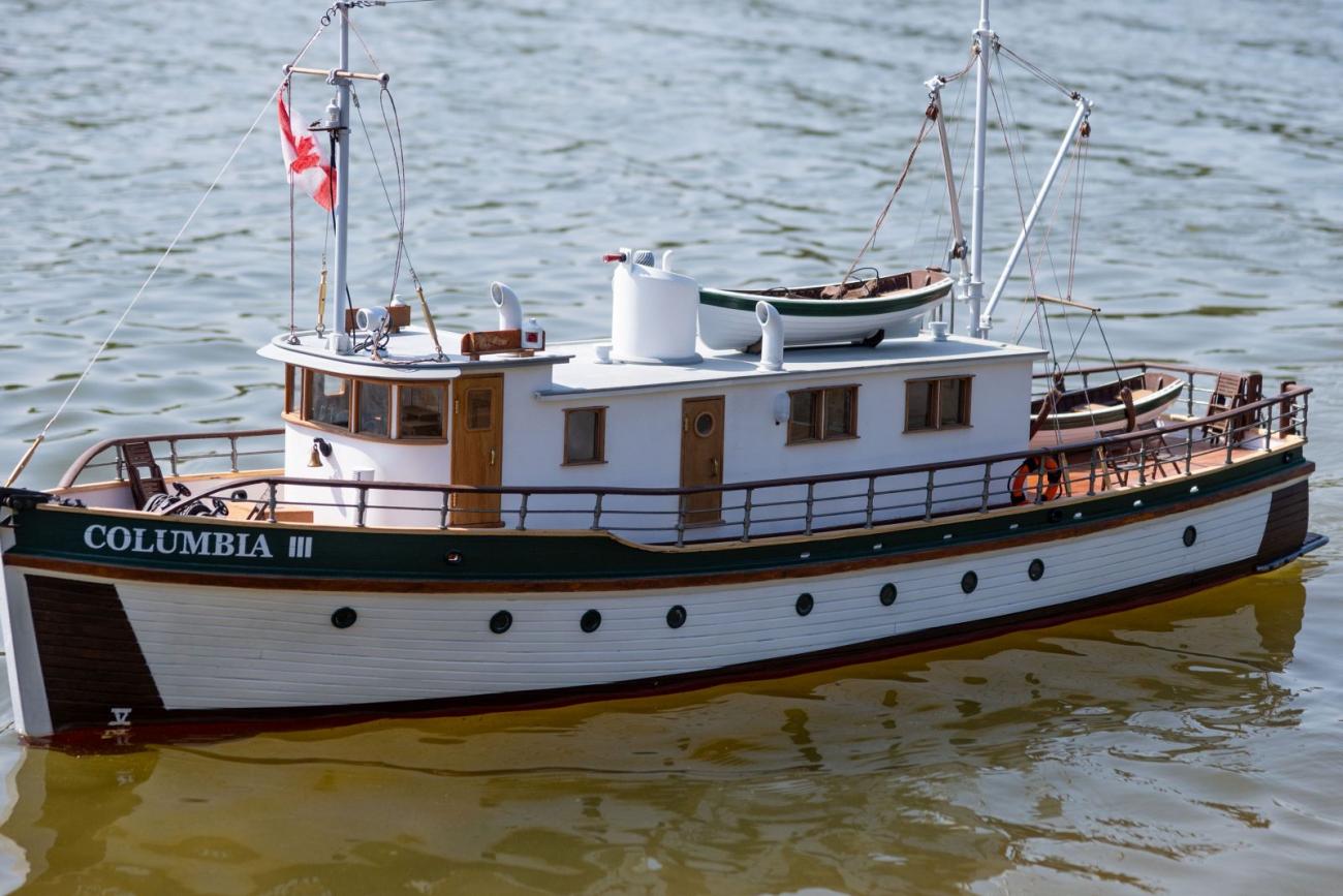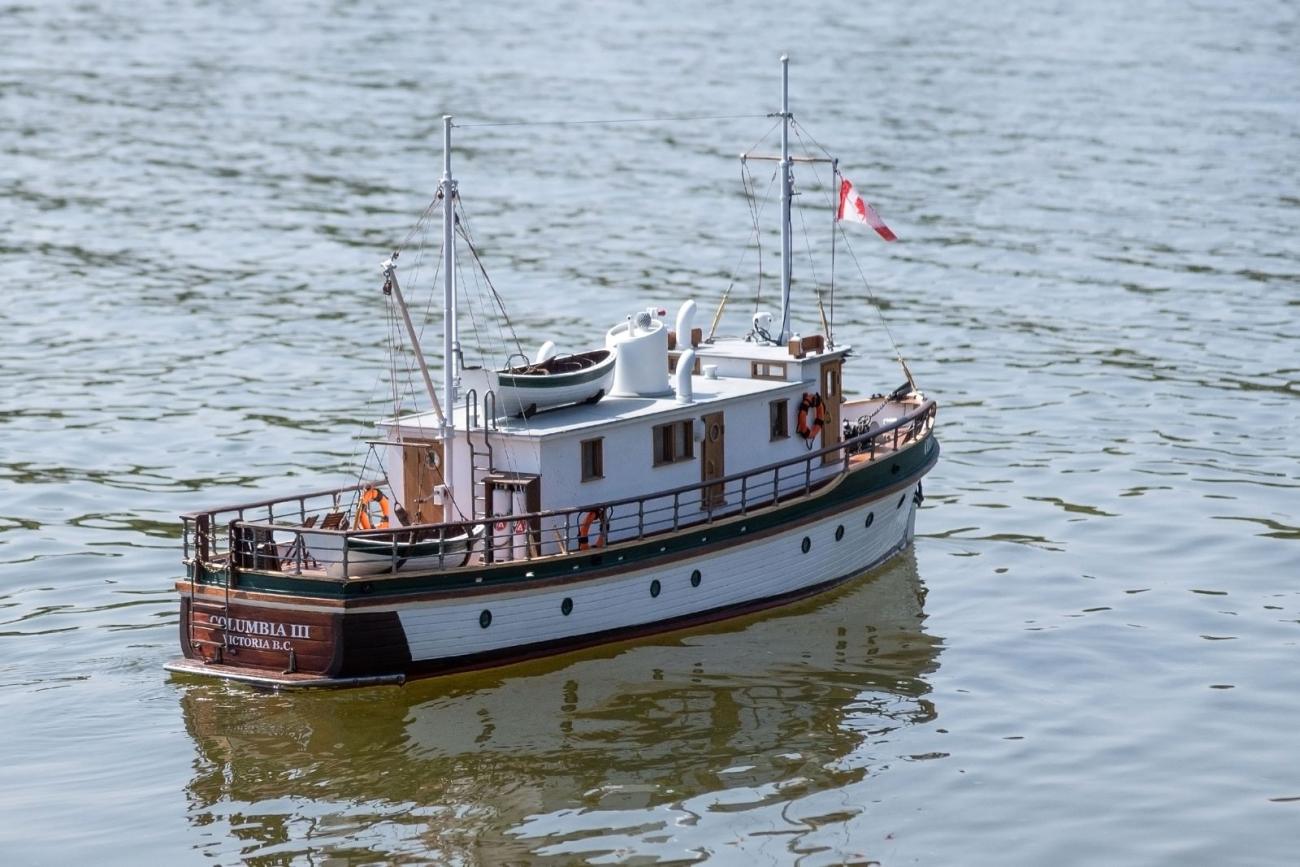 Moje Columbia III je v měřítku 1:20, motor 650, olověná baterie 12 V/5 Ah, výtlak cca 6 kg, délka přes všechno 1025 mm. Postaveno podle původních plánů z roku 1955. Doba stavby dva roky. Je plně vybavena včetně nábytku v kajutách. Konstrukce - směs dřevo, balsa a 3D tisk. Foto je z panenské plavby 20. 8. 2024.