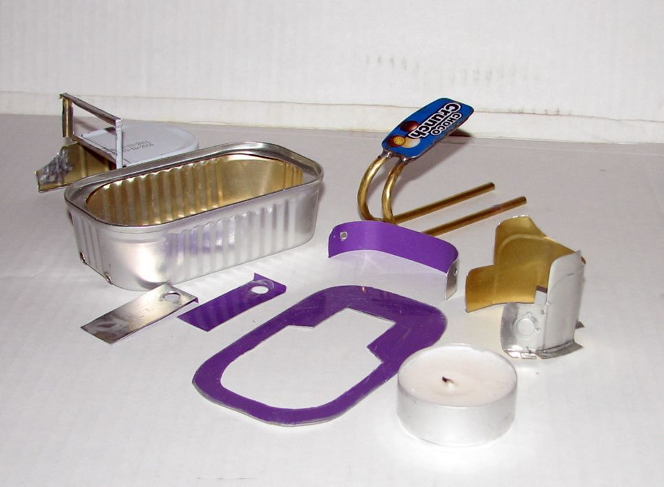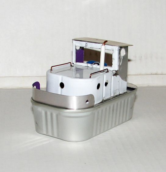 Co budete potřebovat? Nejdříve zajděte do obchodu, kde si koupíte krabičku sardinek v oleji, čokoládové bonbóny v plechové krabičce, pivo v plechovce a čínský luncheon-meat v krabičce podobné té od sardinek. Ještě doporučuji chleba nebo housku. Doma vše s maximální opatrností otevřete a snězte a vypijte. Prázdné obaly nevyhazujte, ale dejte do myčky. Pak ještě skákněte do nějakého „xHouse“, kde za pár korun koupíte mosaznou trubičku o průměru 5 mm. Pak ještě budete potřebovat epoxid 3-TON QUICK s kovovým plničem (vydrží až 120 °C), pájku, cín, kousek drátu a hodně fantasie. Pokud to všechno provedete v pátek (a nebude vám špatně od žaludku) v neděli už váš parníček může brázdit hladinu bazénu, umyvadla anebo jiné louže.