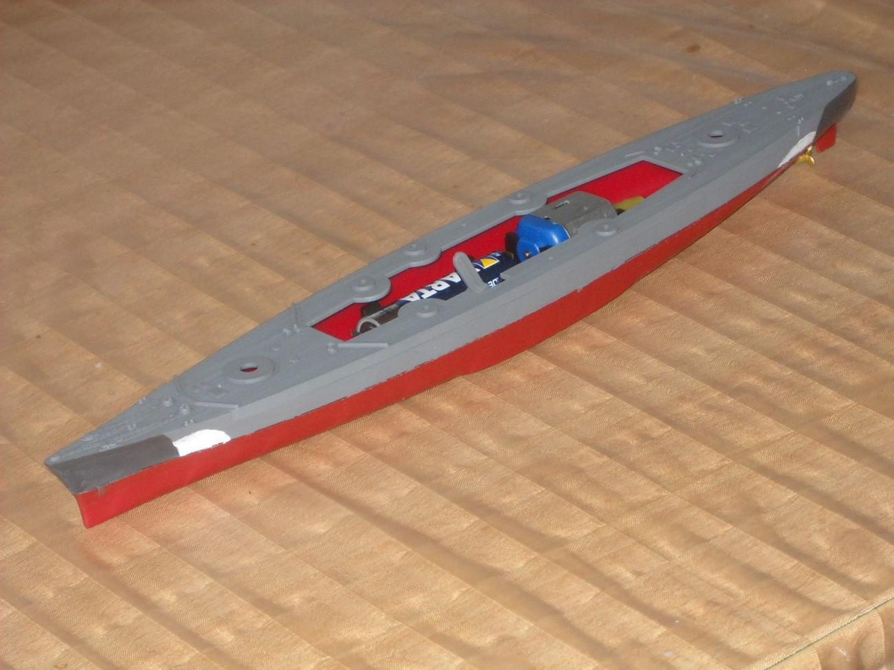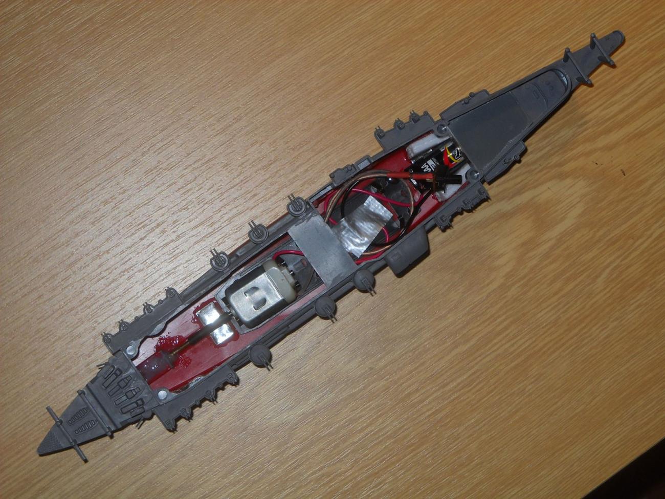 Pohonné jednotky byly převzaty ze stavebnice. V případě Bismarcka bez jakýchkoli úprav, což se později neosvědčilo. Párkrát při plavbě do lodičky zateklo skrz netěsnící hřídel a také s pákou spínače byly zaznamenány potíže v podobě tuhého chodu a kažení vzhledu modelu. K náhradě jsem se však neodhodlal z důvodu pracnosti (bylo by třeba upravit tvar nástavby a doplnit chybějící věže středních a PL děl). Na základě těchto zkušeností jsem si dal u Akagi na těsnost hřídele pozor a namísto originálního řešení jsem raději použil běžný malý páčkový spínač. Akorát nevýhoda, že pro zapnutí/vypnutí je třeba snímat letovou palubu.