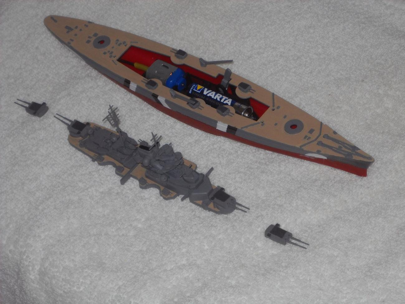 V obou případech šlo také o plastikové stavebnice (Bismarck od Academy, Akagi od Marui), ovšem spíše hračky než seriózní modely. Již od výrobce koncipované jako volně plovoucí a obsahující pro ten účel všechny potřebné díly. A to je právě pro mě zajímavé, protože mě dostatečně neuspokojují čistě statické modely, ale dávám přednost modelům funkčním, především RC. I zde by bylo jistě zajímavé postavit modely jako řiditelné, ale vzhledem k rozměrům (oboje délka cca 30 cm) by to pro mě byla značná výzva. Raději jsem se tedy rozhodl nekomplikovat si život a zůstat pouze u volně plovoucí verze.